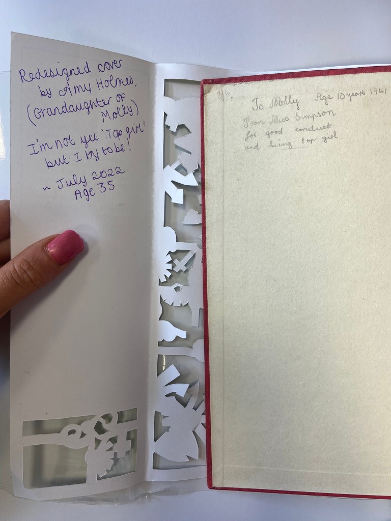 If I was to professionally publish my own version of this book I would have a Red, clothbound hardback book like my Grandmas and include my laser cut designed cover on its 160gsm glossy card and then have a plastic cover over the top to protect the book and the cover from the elements. It is a hardback collectors edition so it needs to be kept clean, protected and dust free. It also makes it feel and look more luxurious and expensive compared to its paperback friends! The inside pages would be from the GF Smith book of paper samples – I have chosen 115gsm Glacier White paper for the pages of the book because it is thin enough to be able to turn the pages easily but it is also a luxurious, smooth finish (as I attempt to show in my video!) I wanted to use a more luxurious feeling paper for my hardback collectors edition to what I would use in my paperback edition.