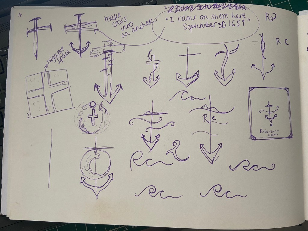 I was trying to from a cross as part of an anchor (remembering the cover above I talked about that gave me inspiration with the anchor and the RC) Could I form the rest of the story in with this simple illustration? Could I add some waves and the island and it become a symbol yet an image that is easily understood what it is?…