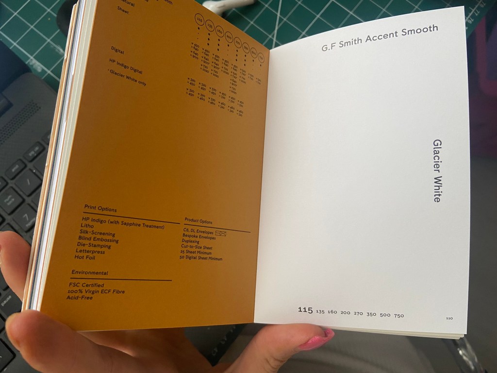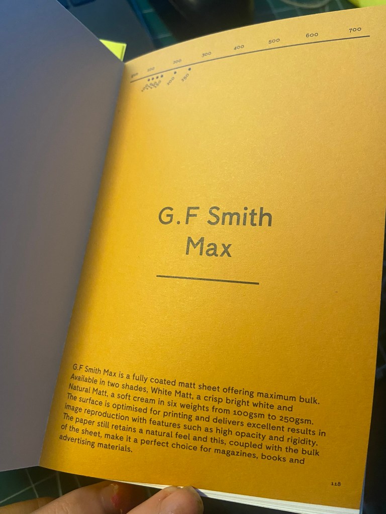 My GF Smith paper sample resource book has been a blessing! – this allows me to have every kind of paper sample literally at my fingertips with useful information to accompany it on what the best uses for the papers are! I would have struggled a great deal without it by having to rely on my my free samples sent out by individual printing companies which are ok.. but they are not as informative or organised into categories like the GF Smith paper samples.