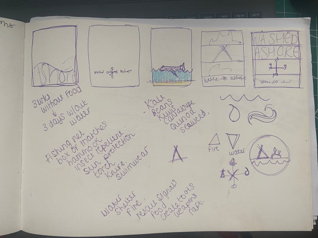 I started brainstorming ideas around what I could do for the survival guide… I even watched Castaway to try and get some ideas for what I could use on the cover! Chris kept telling me to use Wilson as the main design… *eyeroll! ;D