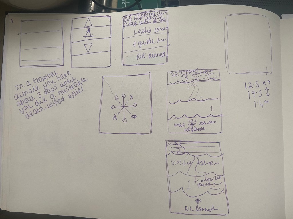 I then went back to look at the cover for the survival guide – “Washed Ashore” my tutor liked the potential in my original design but just did not see that it worked as a survival guide or to tie in with the two Crusoe novels. I can see her point of view from reading through her feedback; although she liked my humorous approach for my original cover for it, she said there was trouble distinguishing whether it is a novel or a guide.