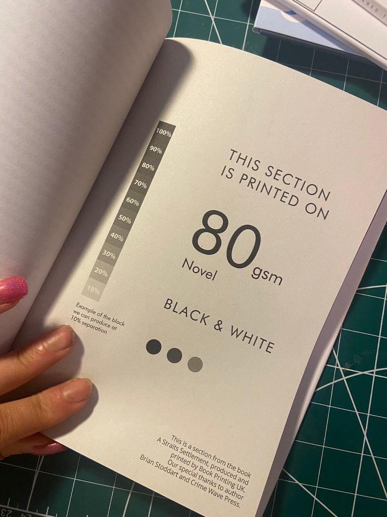 I then created a very similar layout to that of my hardback edition. I didn’t need to split the design over 2 sheets this time as the size of the book cover fitted on an A3 sheet and was easily printed onto 1 sheet. Again, I used the same 160gsm glossy, card paper stock that I used for my hardback cover – just because it prints a dream and because it gives a nice glossy appearance and is strong to keep a book protected.