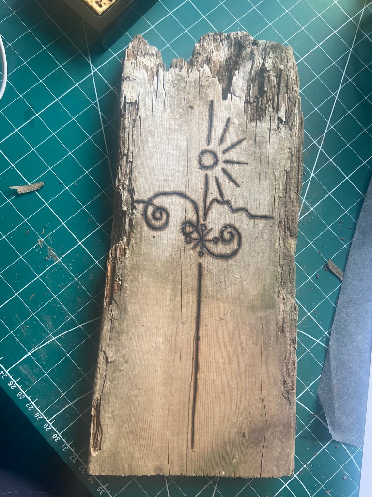 My in-laws have a plot of land with some old glasshouses on and let me tell you there is nothing you couldn’t find in there! – after searching for a short while I came across the perfect piece of flat wood which would work well enough to etch onto. I etched my fine line illustration onto it, (thicker lines just did not work with this illustration as the lines got lost and blended in together).
