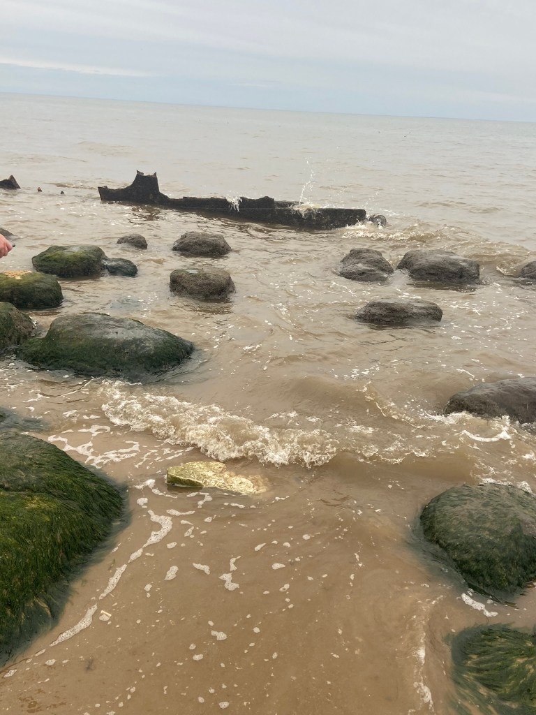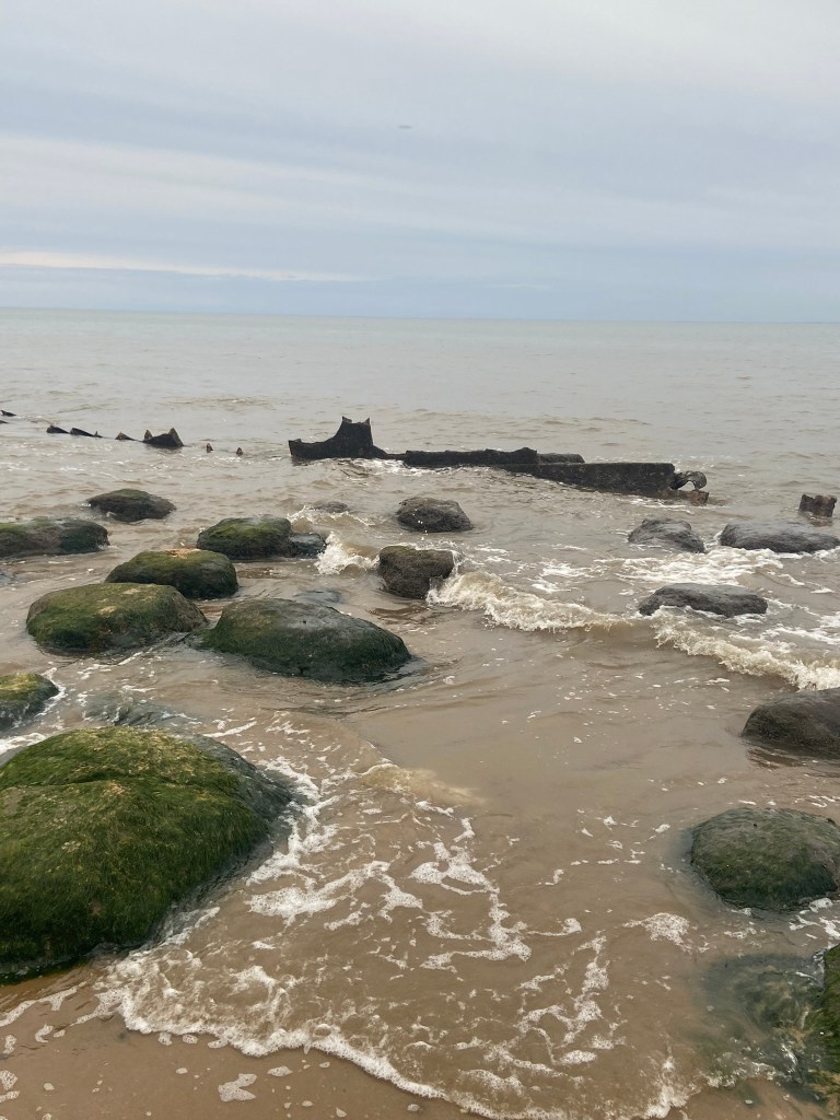 It wasn’t the most sunny, scenic day in Old Hunstanton on this day, even though it was July!- It was a little cloudy and we very almost got cut off by the sea trying to photograph the old ship wreck! I was gutted the sea was coming in quite quickly and we couldn’t have had some photographs with the piece of wood right near it! – fits the narrative right?