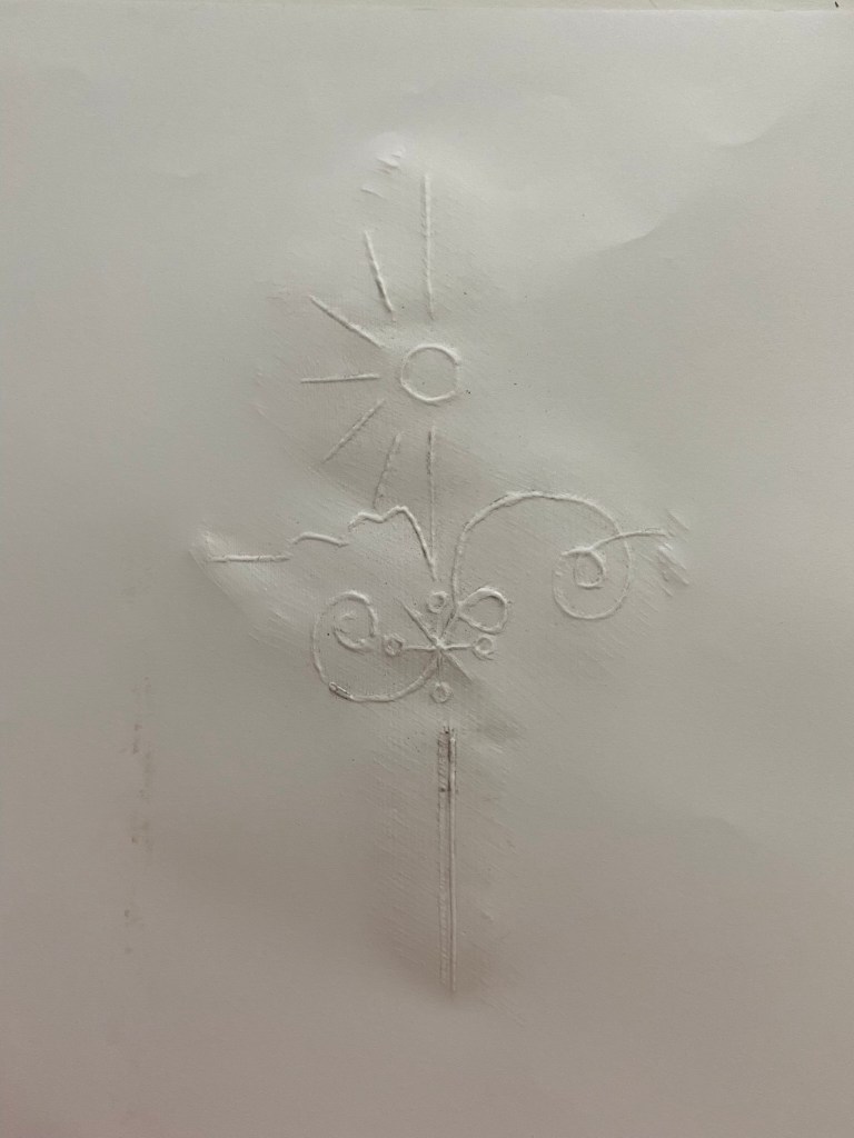 I used a pencil originally to etch over the top of the wood but then decided to just try an embossing pen over the top which worked really nicely. I then decided to try and block print with it by using lino paint and a roller to roll the paint over the top and then press down onto the paper. I liked this technique because it looks like the illustration has been drawn into blood; Robinson Crusoe does have a darker side to its story with the Cannabilism and murders so this could tie in with the narrative!..
