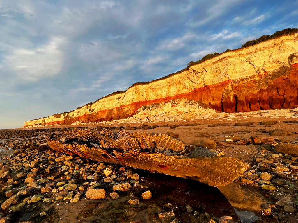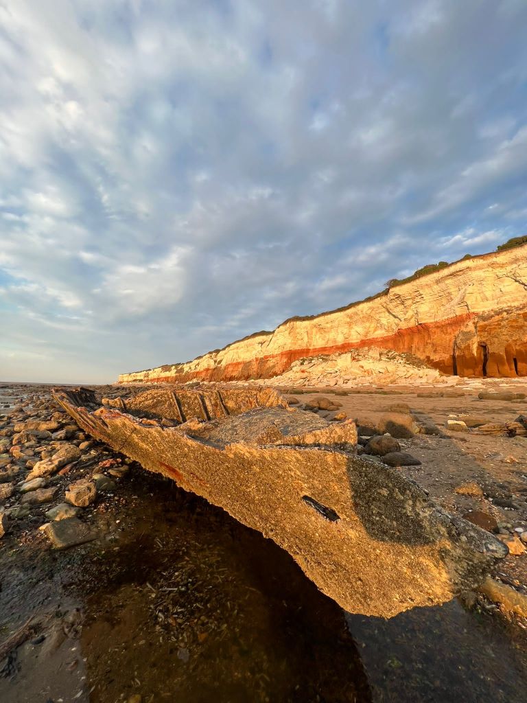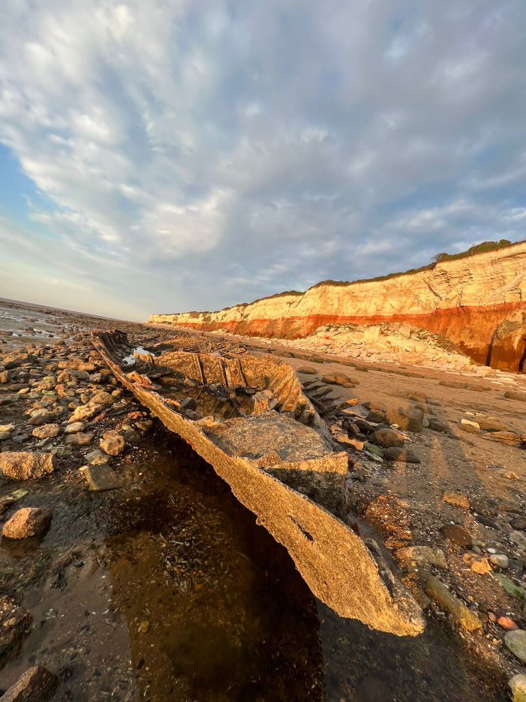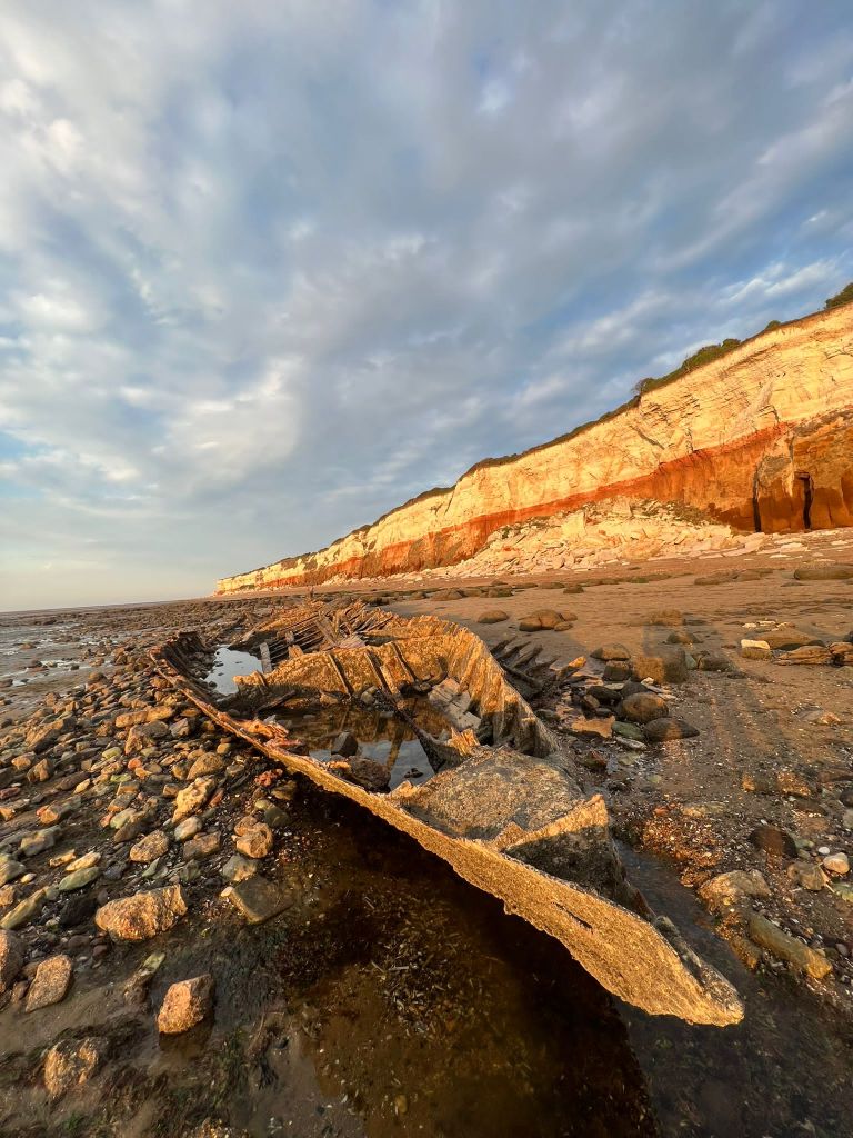 I decided to also go back to the shipwreck at Hunstanton Beach that I was previously unsuccessful at reaching before high tide! – I wanted to see if I could get any good photographs of the ship wreck to include on one of the covers so that it would tie in more with the narrative. I went on a beautiful afternoon at low tide and I was lucky enough to get great photographs this time!