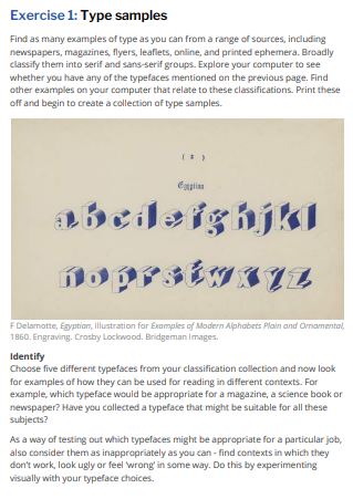 Find as many examples of type as you can from a range of sources, including newspapers, magazines, flyers, leaflets, online, and printed ephemera. Broadly classify them into serif and sans-serif groups. Explore your computer to see whether you have any of the typefaces mentioned on the previous page. Find other examples on your computer that relate to these classifications. Print these off and begin to create a collection of type samples.