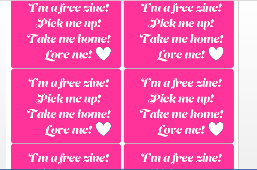 But when I printed them out and stuck them to my zine I realised that the “Love” actually looked more like “lore” just because the line width of the V is that thin that it didn’t print accurately. I thought I could potentially get away with it as I was in a rush printing them out and to be honest I wasn’t particularly too pedantic with them as I just wanted to make it clear to people that when they see my zine lying around they are free to take it! It was only when Chris turned around to me and said “What is lore?” that I realised I had failed in my task!..