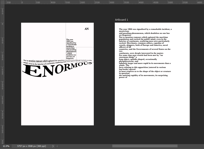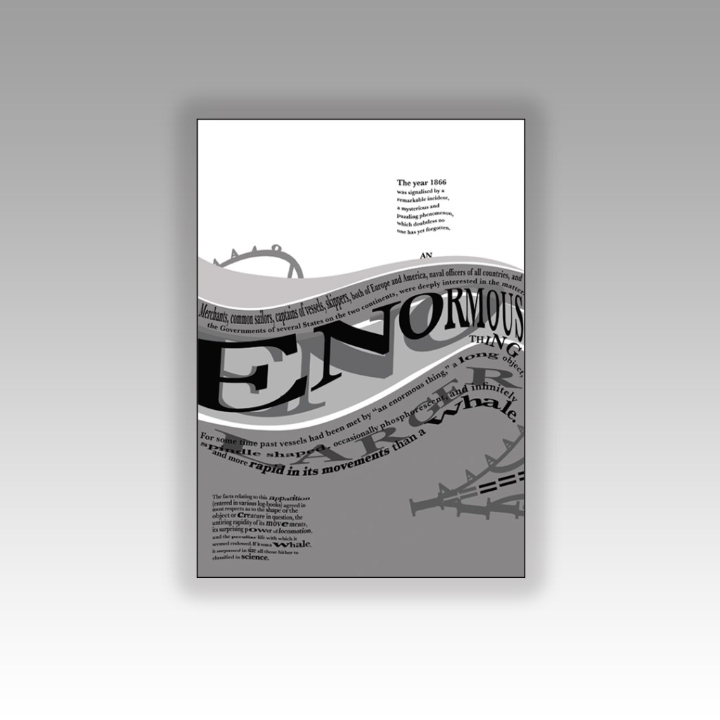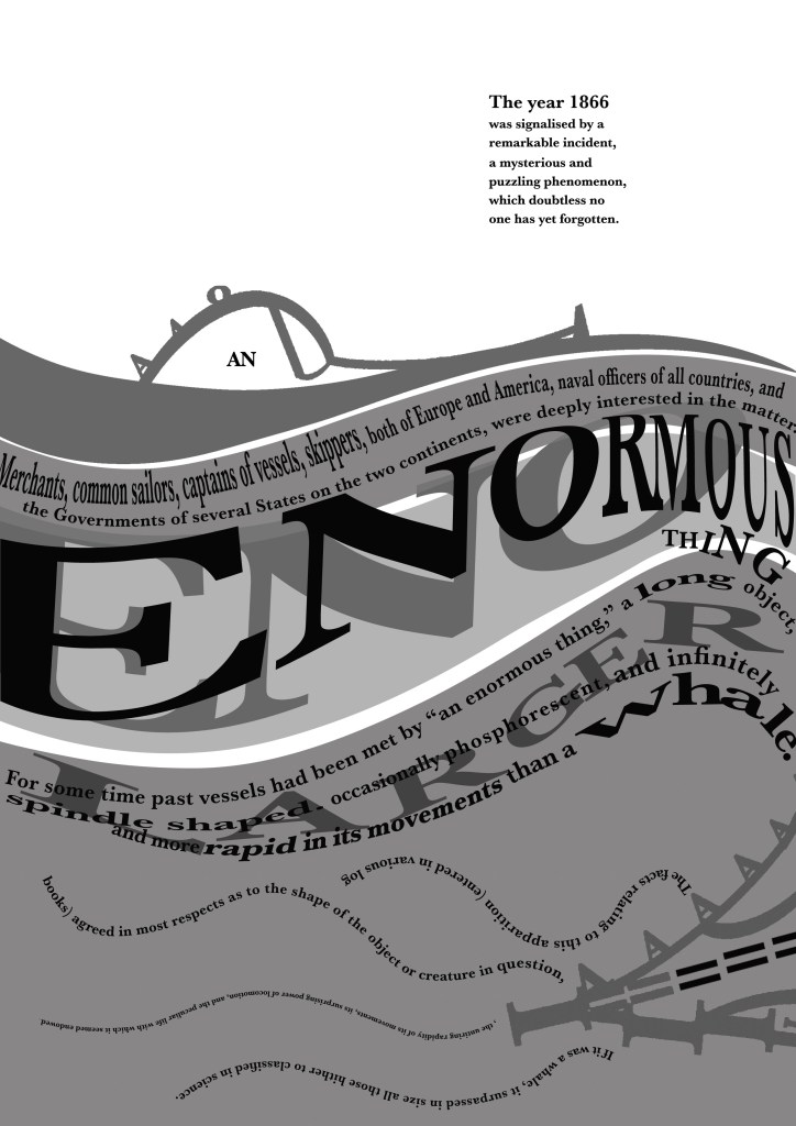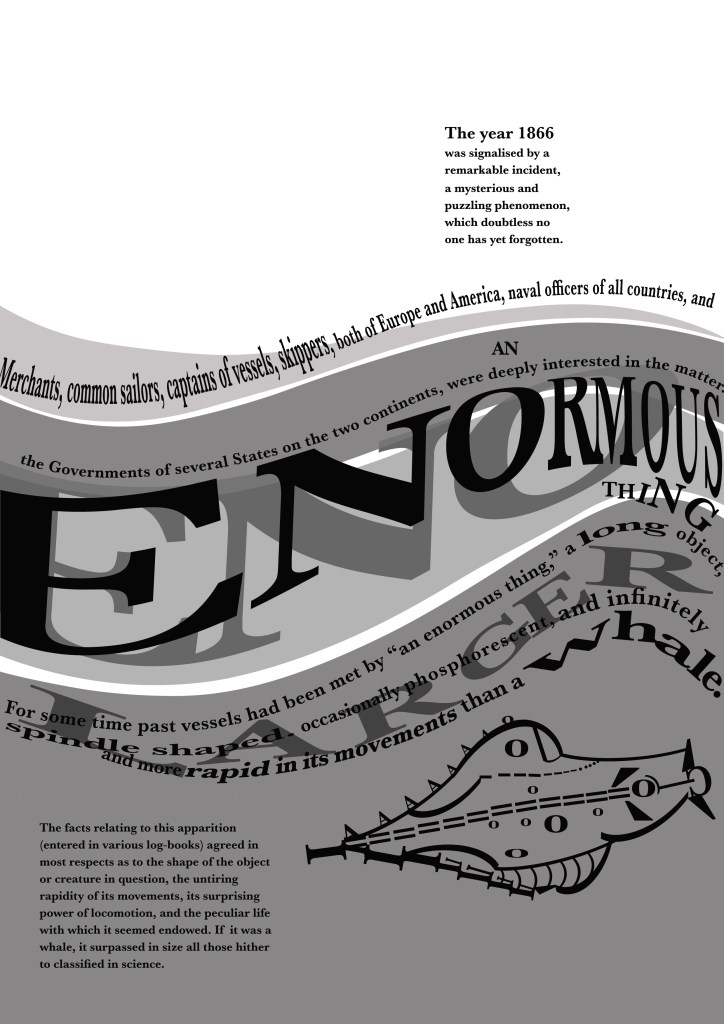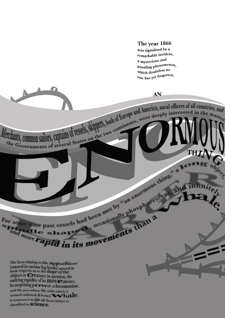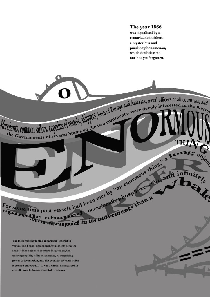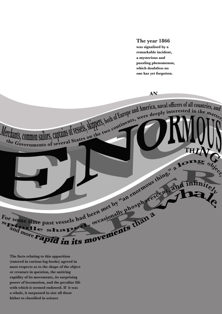 An enormous thing” is an important part of the extract and story because this is what people called this mysterious “whale-like object”. I needed to emphasize “enormous” and show that it belonged in the sea. I used the wave tool in Photoshop to adjust the word so that it looked like it was in the sea and then adjusted the point size of some of the letters and also the horizontal and vertical scale to (controversially!- sorry typo police!) stretch the letters out! I also adjusted the tracking and kerning to make the letters look more interesting and to add some contrast to the piece!