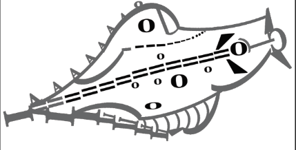For this version I cut the drawing in half and placed half above the sea (which is where and how people would have seen it in the storyline!) and half below the sea. The way it forms with the wave makes it look like it is circling the sea creating the waves as it moves. The extract is all about the movement and speed of the mysterious being and I feel that this shows this. I haven’t suggested whether the enormous being is a creature or is man-made technology – it is open to the viewer what they interpret it to be! The O on the monster could be an eye or it could be a window… the A’s on the monster could be natural spikes or they could be man-made weapons on the side of a submarine… I also feel that it allowed for more space on the design and it balanced out the layout.