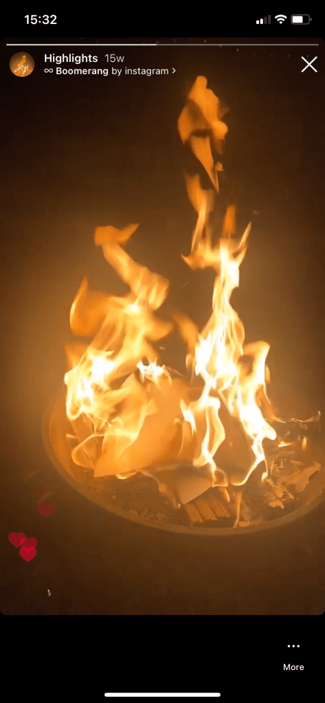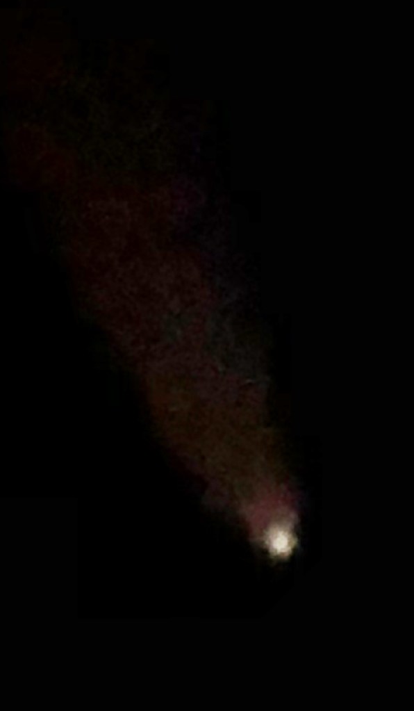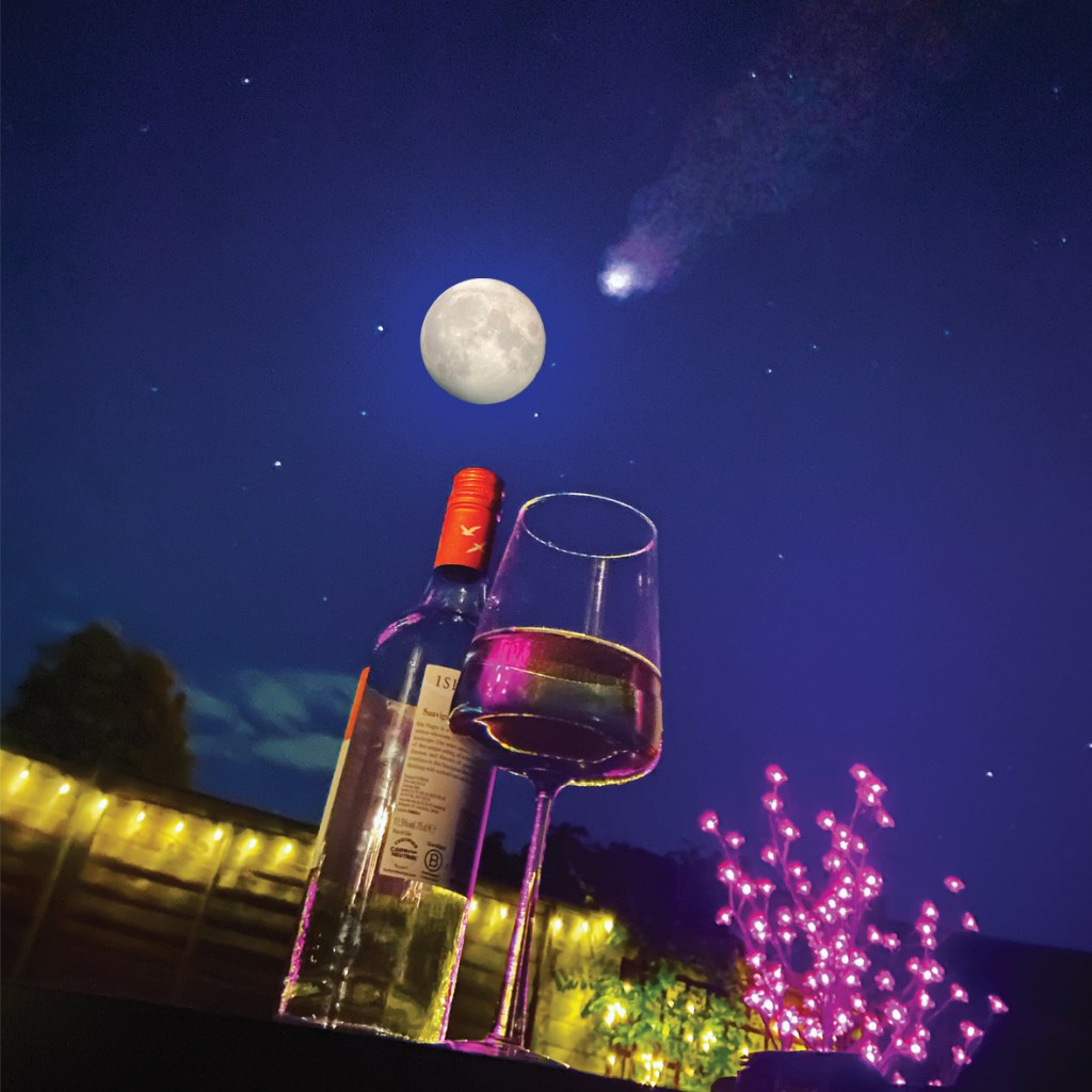 My original idea for this again differs from the image I eventually went with. I had the idea again of suburban 1950s couple having a glass of wine and holding a stethoscope up to a comet.. a tongue-in-cheek, playful approach… however, once again trying to find free, copyright images of a 1950s couple was challenging.. I then remembered back to when I got my new iPhone in May and I was drinking wine outside with a firepit on a really clear night and messing around to see how good my new camera was. I took a really good photo that I Instagrammed at the time because it was so clear! The night sky was a royal blue and the stars were twinkling! It then reminded me of how me and my fiancé have also photographed the moon through his telescope before and also one of the first nights we spent together photographing and watching comet Neowise from 2020. If I could merge all these photographs I could create my image for this part of the poem.