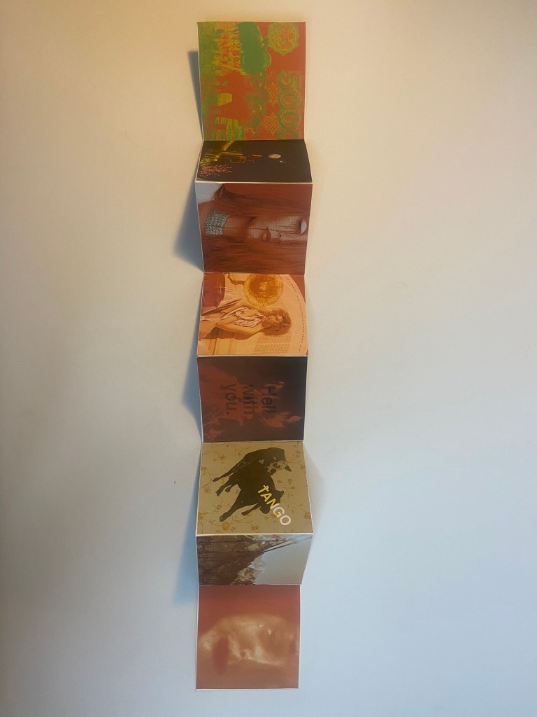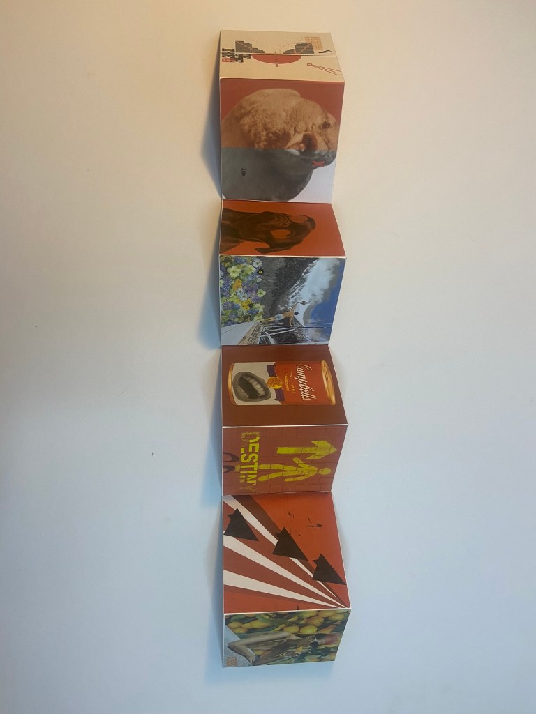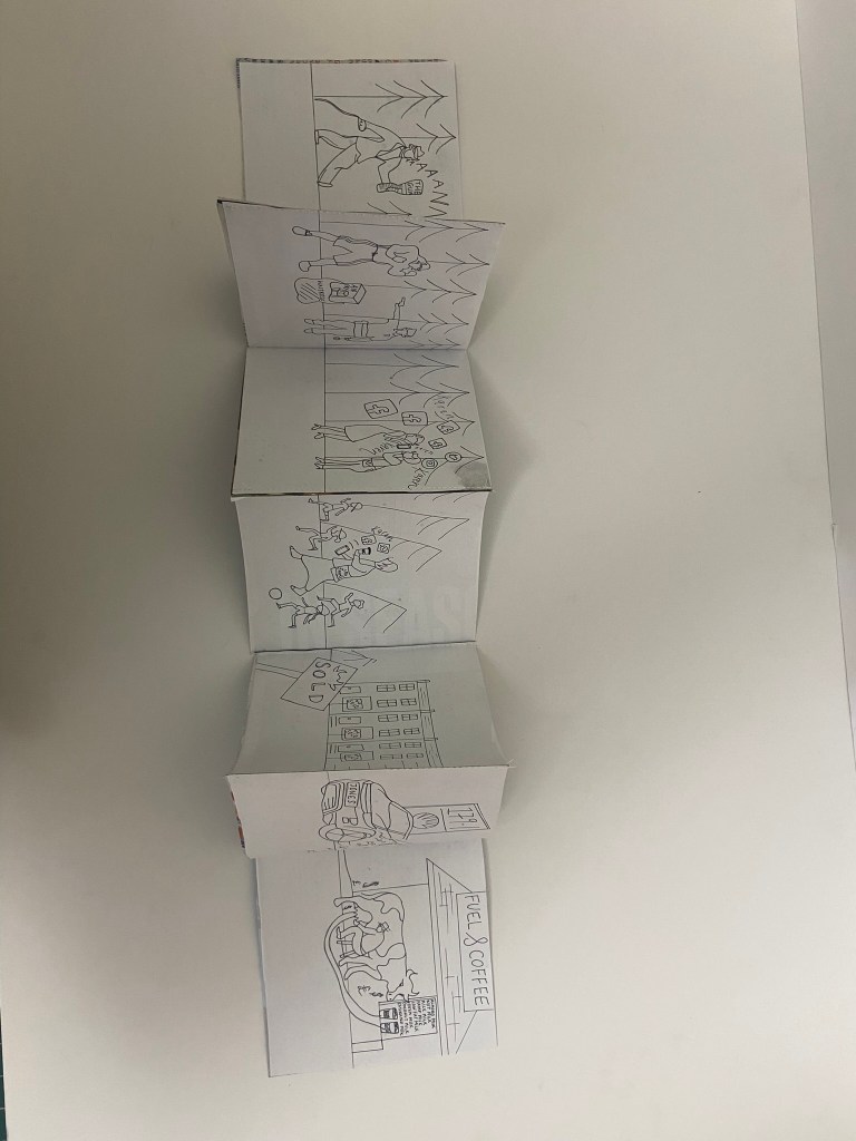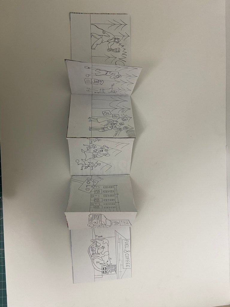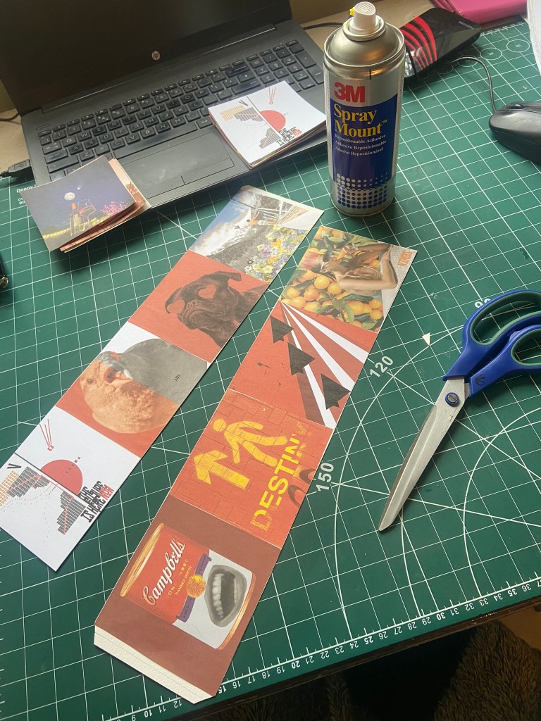 For my book to be folded and stable and hold its own weight when it is stood up, I needed to use a white board for the backing. I have 16 images and I needed to distribute them evenly on both sides of the folded book so I placed the beginning 8 narratives of the poem on one side and the remaining 8 on the other side. Sadly I have been stuck at home with really bad flu for 3 weeks now and haven’t been at work to use the lovely colour laser printer so I had to do a home DIY job and print my images out using the inkjet printer. This is not something I would want to do all of the time because the quality of inkjet printers are poor – they don’t give that glossy professional look and feel that laser printers give. My inkjet printer is only a basic A4 home printer so there is no way that I could rearrange all of my pages to fit onto one sheet of paper! I needed to organize my images into groups and print them into groups to then photo mount onto the whiteboard backing. I printed all my images onto A4 plain white copy paper. If I was to have these professionally printed I would make sure that they were printed on a high quality, glossy lightweight card.