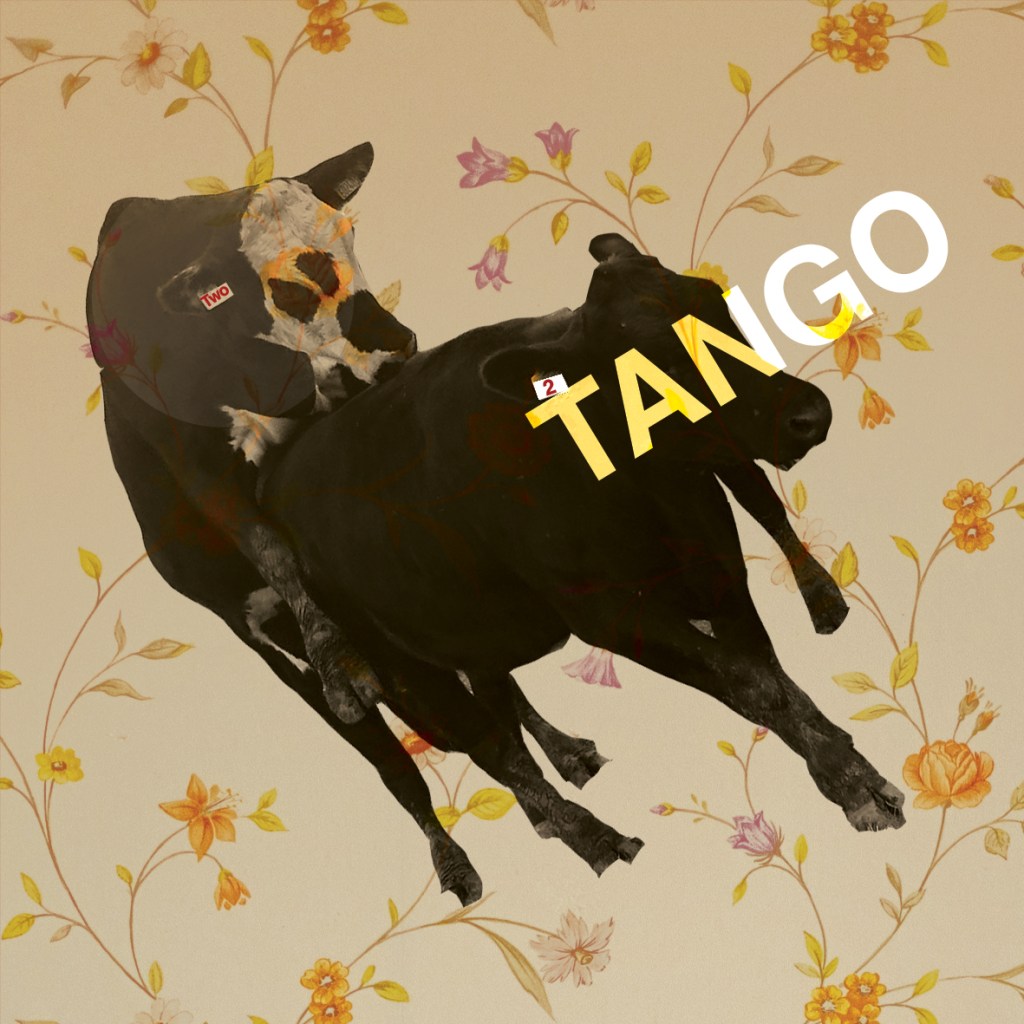 Immediately I thought of this photo of the 2 cows against a floral suburban backdrop with maybe a big grin imposed onto one of the cows, (a bit like the tinned mirth!) as the main image! I tried it but it did look a bit distasteful and like I was trying to reference humans having sex with cows! – so I quickly dismissed that idea and simply used the term “It takes 2 to Tango”.
