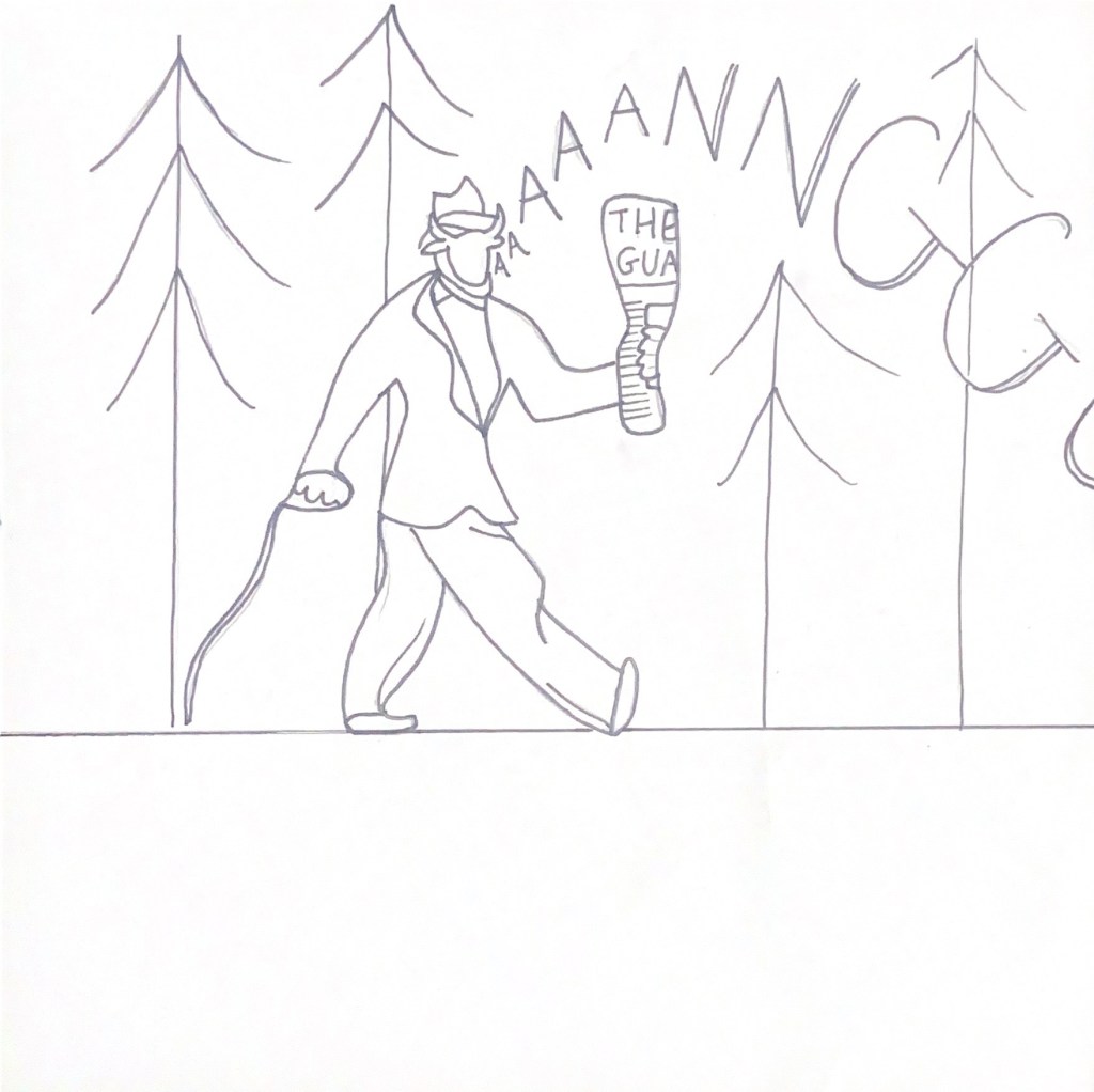 It starts with a smartly dressed man walking his dog in the suburban park, the Dog who is called Angus (middle class!) after picking up The Guardian newspaper from his local Waitrose!