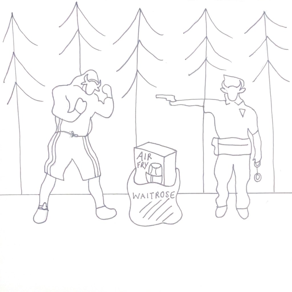 It then moves further into Suburban woodland with a man and a police officer having an altercation over an Air Fryer in a Waitrose bag. Both parties are wearing Cow masks to represent the fake mask of façade that is being portrayed and it also shows the fight against the “Cows” where they are trying so hard to maintain that middle-class front and rebel against change.