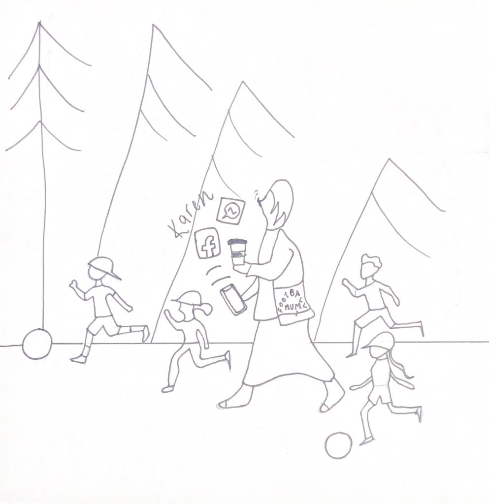 It then progresses forward to a scene where a couple of gossiping women are watching the fight from afar and are photographing it all to send to their fellow Football mums and to plaster all over social media. This is a nod to the “Karen” trend where groups of self absorbed, narrow minded women live their lives according to Facebook and try to tell others how to live their lives!