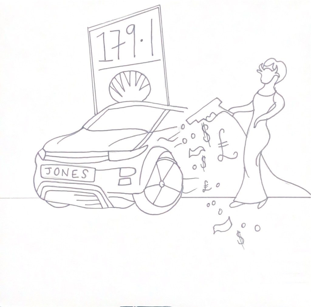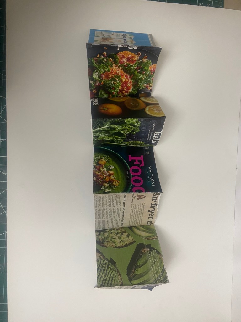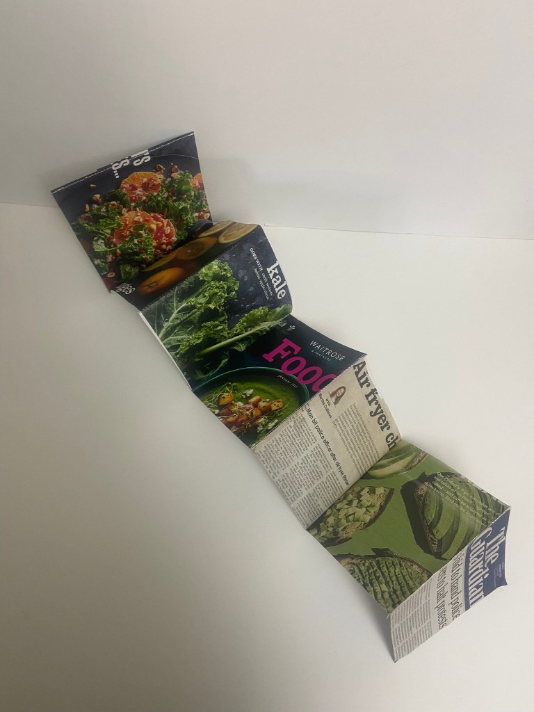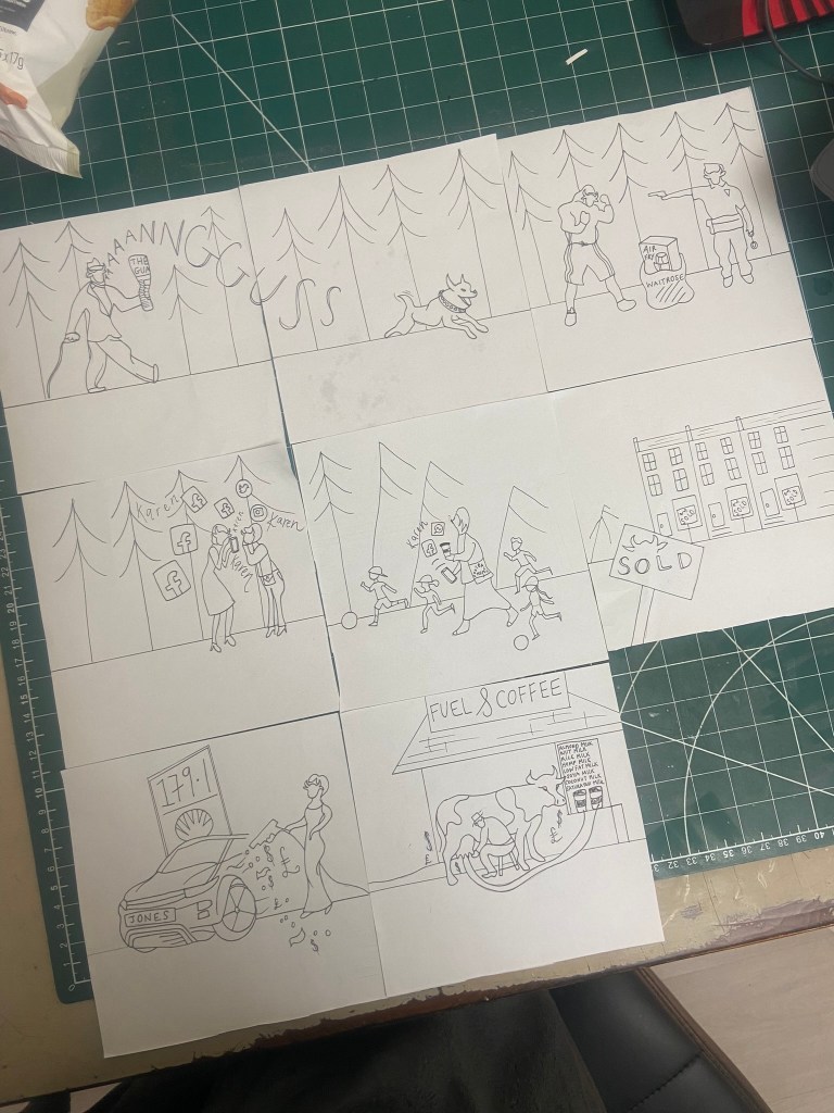 I then used the Waitrose magazine and the newspaper to cut out relevant, appropriate images that might closely match my interpretation of the poem. The images with the Airfryer were quite humorous as this is an icon of middle- class, lockdown suburban bliss! This is something that sums up everybody following a trend like sheep! I also found in my local newspaper a report about a fight that incurred over an Airfryer which gave me ideas for my design… The increase in fuel prices best sums up technology and greed, The Guardian newspaper is the middle class paper so I have used a piece of that to use in my design and I also have images of Oranges, Kale and avocados which relate back to the Oramge Groves but also represent middle-class Waitrose! I have to say though, I do not shop in Waitrose and I still buy Avocados, have an Air Fryer and have Kale in my stir frys!