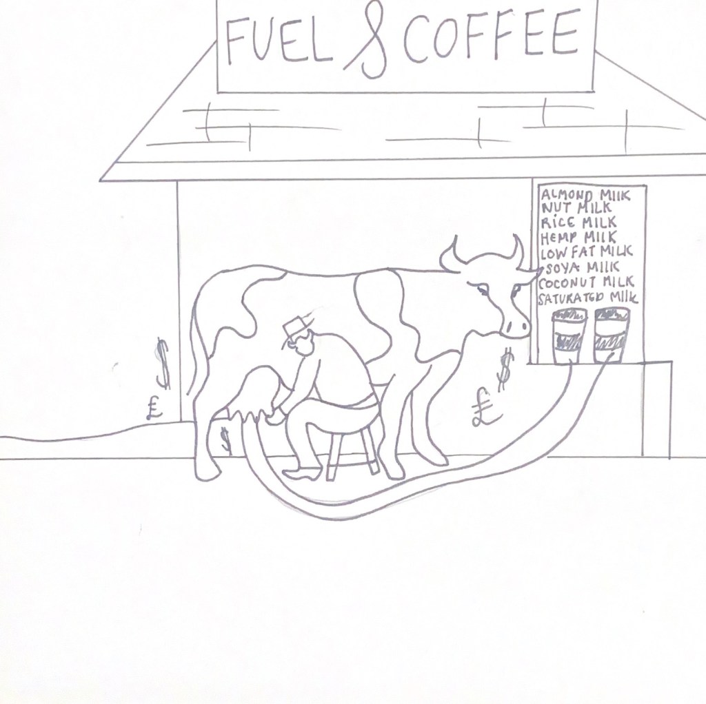The fuel and coffee scenes show the greed and the unnecessary money gained and spent.