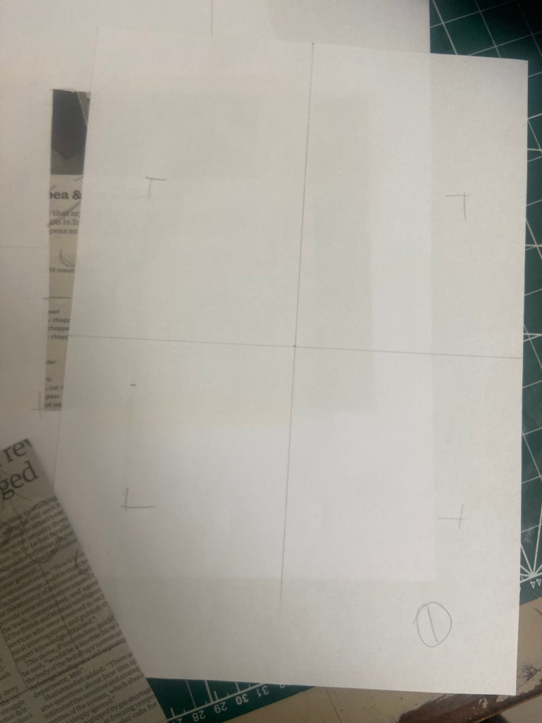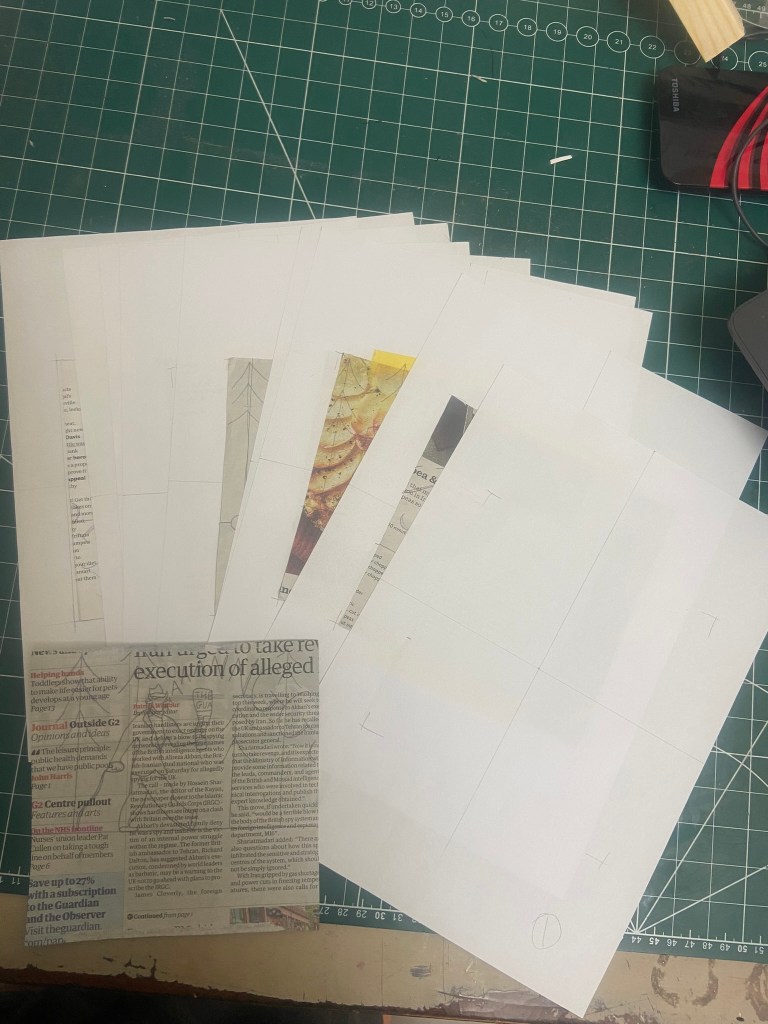 I then started to work out how I would print the images onto the back of the Waitrose magazine and newspaper pieces I had cut out. I stuck the squares that I had cut out already in the middle of A4 sheets that I had measured out the exact middle and then printed my images directly over the top. It worked but it didn’t; the magazine and newspaper were too heavy for my finely drawn illustrations so I ended up resorting to printing them onto plain A4 white paper so that they would be easily seen.