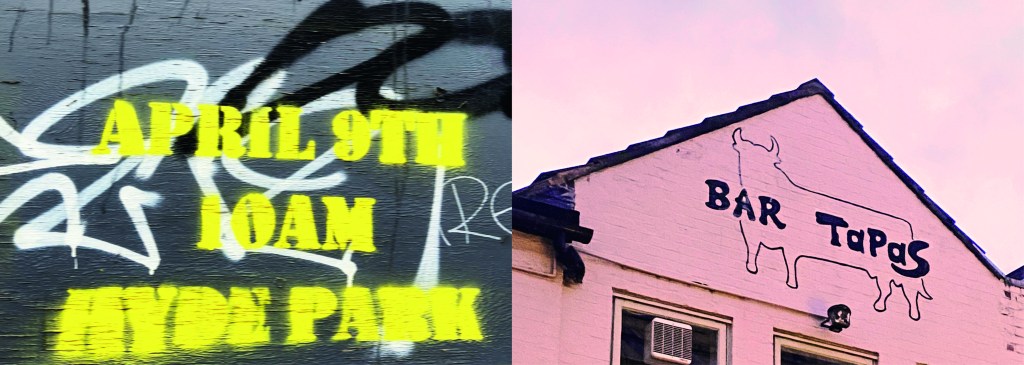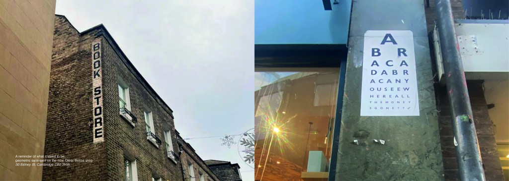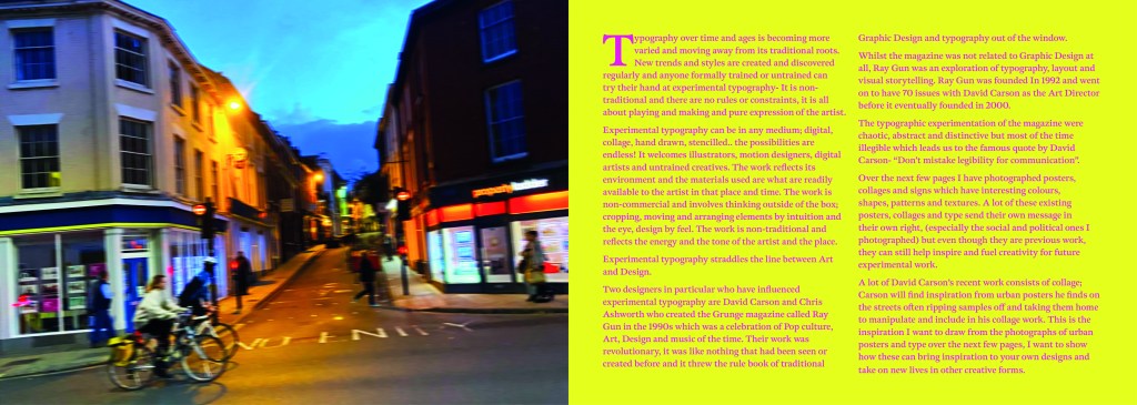 I figured out that my book would have three chapters: Chapter 1 on vernacular typography which would feature the shop fronts, signs and any interesting typefaces I found on my travels. Chapter 2 would focus around the street art; Graffiti and more humanist typography done by hand lettering and handwriting. Chapter 3 would focus around posters and collages that feature interesting type which would then lead into a little bit of information about David Carson whose recent experimental typography work involves collage.