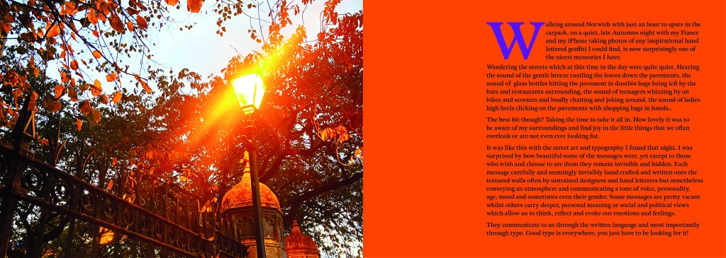 These 2 pages were a personal introductory to street art, I documented how important it is to be aware of your surroundings, live in the now and really take in everything around you because you never know what you might find! I used a photograph I took of a street light near a church yard in the middle of Norwich, I just remember thinking how pretty the orange leaves looked against the brightness of the lamp.