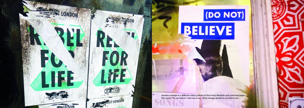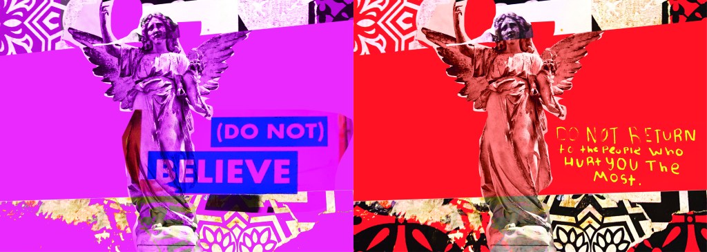 I created these using one of the collages I put together for chapter 3 using snippets of type, snippets of mandala/floral inspired paper and clips of posters. The head of the angel was actually on one of the posters I took a photo of, I have no idea what it might have been, it was just a head! I then went onto Google and found a body to try and best match up to this angel! It is eccentric and weird but I kinda liked it! It is like the word of God! I couldn’t help resist balancing a capital A on his/her finger either!