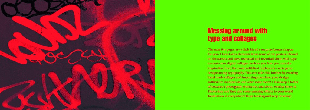 I created a few examples, I would have liked more time to spend on this hidden chapter as this is really what inspired me to create this book! I would take photos and then use them as textures or as backgrounds or inspiration for any future work! It would be quite cool in the future (even just for fun!) to create a book full of these new, fresh designs made from existing type and work.