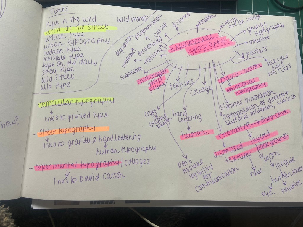 I also mind mapped some research around vernacular typography, street typography and experimental typography: