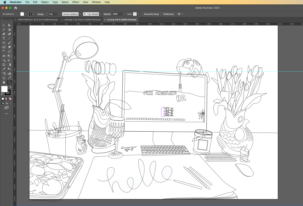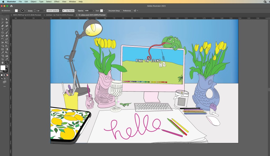 I added colour and I just didn’t think much of it. It had everything in the illustration from my desk space but it didn’t show Pink Angeleno… there was nothing pink truly about it and the only element that hinted on LA was the wallpaper on the Mac. I have my cuddly toy chameleon (George!) sitting on top of my Mac and thought it would be fun to make him interact with the screen in the illustration!