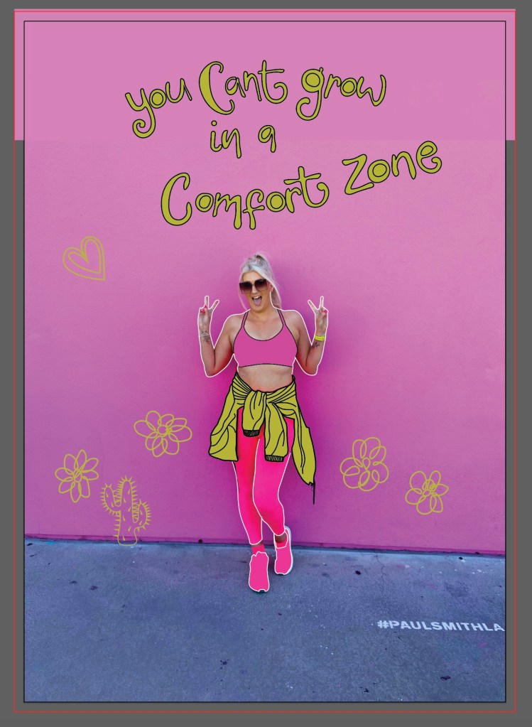 “You can’t grow in a comfort zone” is pivotal to me – it is what made me jump out of my seat and go for it in the first place. in my first ever sketchbook I drew a random doodle of this so it was only relevant to use it as part of this. Free Falling, a song by Tom Petty describes the emotion of wanting to fall off the top of the Hollywood Hills – it is I believe a song about getting out of a relationship but I associate it more with a feeling of escaping reality – that is very much the basis of the origins of Pink Angeleno. Melrose Avenue is just a cool place – shady in some areas I guess- but just a cool place! It is full of street art, graffiti, bright colours, thrift shops, unique bars and everything quintessentially LA!