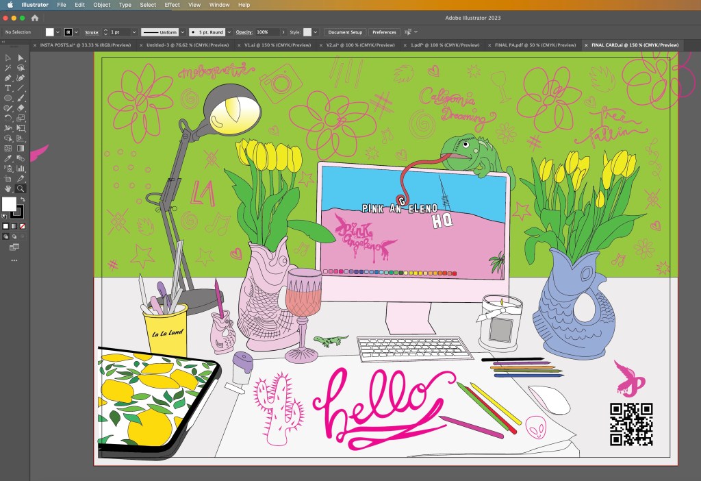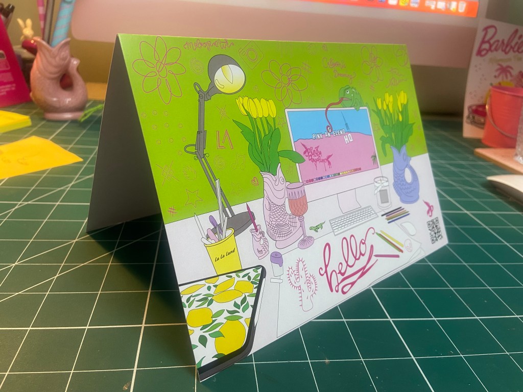 I sometimes on my social media post a photo of my desk space with the caption “Greetings from Pink Angeleno HQ” SO I decided to move forwards with this idea. I had the idea to illustrate my working space on the front of the card. I then had the idea to make the card have a design on the front and the inside and allow the design from the front to flow on the inside of the card. How I imagined this was to have my Mac on my desk space have a wallpaper which would then continue onto the inside. The wallpaper I had in mind was the Hollywood sign and then on the inside of the card I would illustrate more of the Hollywood Hills from a photograph I actually took whilst I was hiking the Hollywood Hills and include some little illustrations around the outside of other things in LA that I liked which would sum up my interests and why I called Pink Angeleno “Pink Angeleno”.