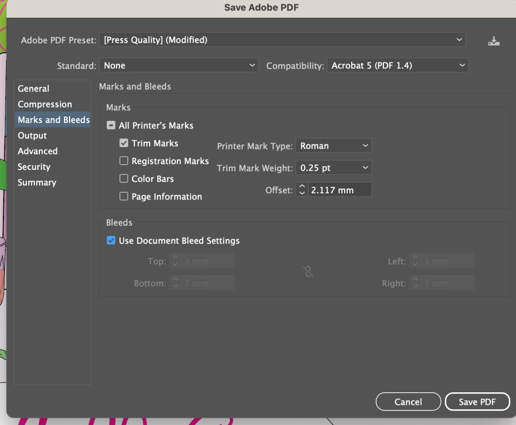 My document was set up in Illustrator to an A5 size with a 3mm bleed.