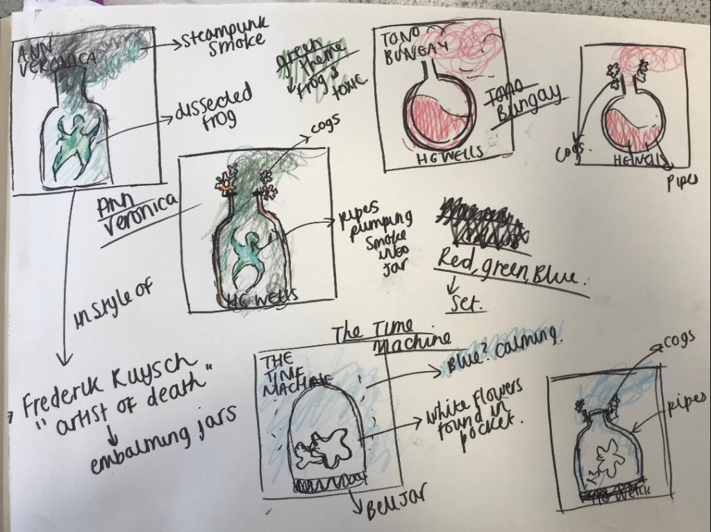 I then explored with the idea of using 2 different designs on one page by using different media for each idea and then overlaying them somehow on the cover… maybe like a collage or different textured paper on different colours to add some contrast to the 2 pieces. I had an idea in my head of drawing the bell jar, a top part of a skull sat at the bottom of the jar and the 2 white flowers growing out of one of the eye sockets. (the skull representing the darkness from the Morlochs underground) I want to push myself to create something that is “darker” than what I would usually explore. In my last assignment the feedback was to explore with different textures so I feel that this ties in nicely. I then thought I could potentially draw this design onto textured, mottled, old looking paper and make it look like one of the old Victorian botanical books/postcards I looked into…