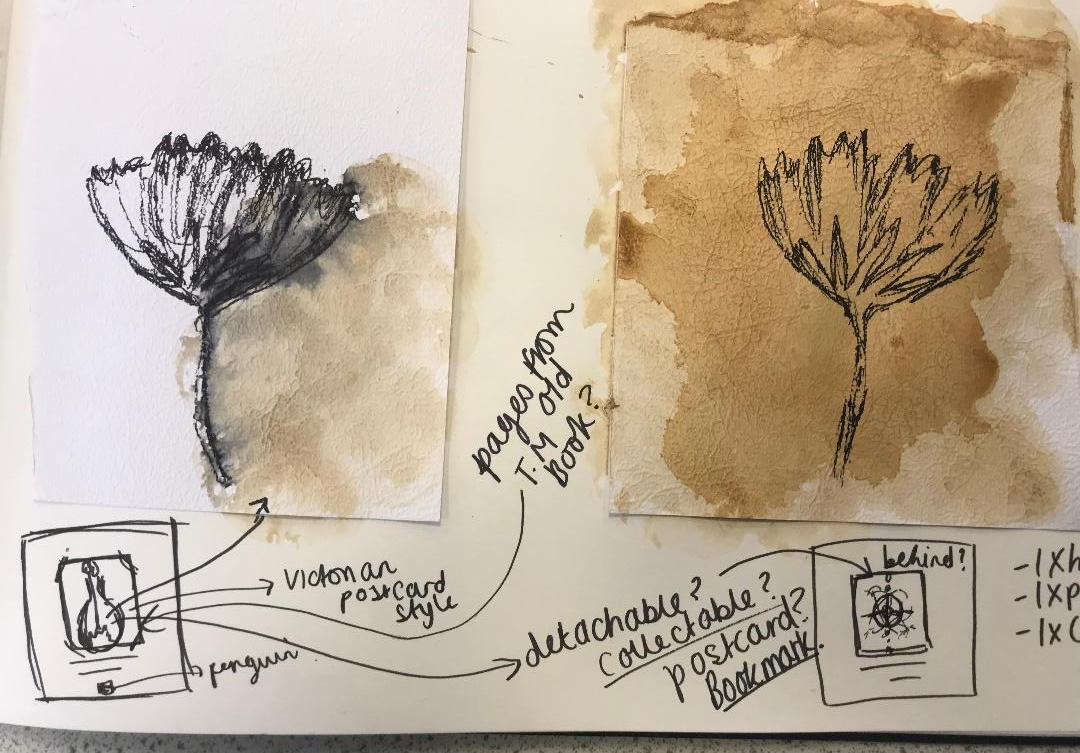 I worked some more on the development of my final idea, I had another go sketching out what I would like on my final cover to see how it would work! When I have completed the drawing it is my plan to copy it several times and experiment with different looks and techniques (I want to try the tea staining and watercolour again)