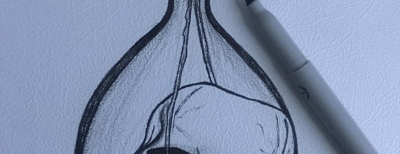 Last night I finished the second attempt at my drawing! – The new and improved version with the “time” element. I feel that when you look at this image you can get more of a feel about what it is relating to rather than the version with just the bottle. it works better as an overall design for the book as it gives away more of what the story could be about.