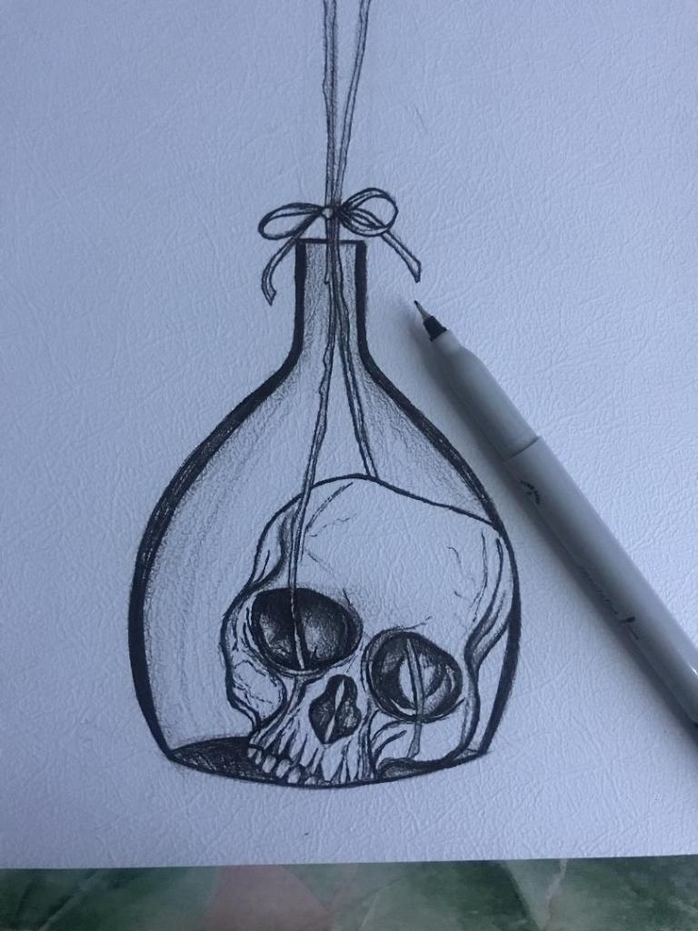 I want a potion bottle with a skull sitting at the bottom of it and the flowers coming out of the skulls eye socket straight out the top of the vase. The water in the bottle I want to look murky and dirty as it represents the Morlochs underground. I decided to give it a go drawing a skull in ink and then go from there!..