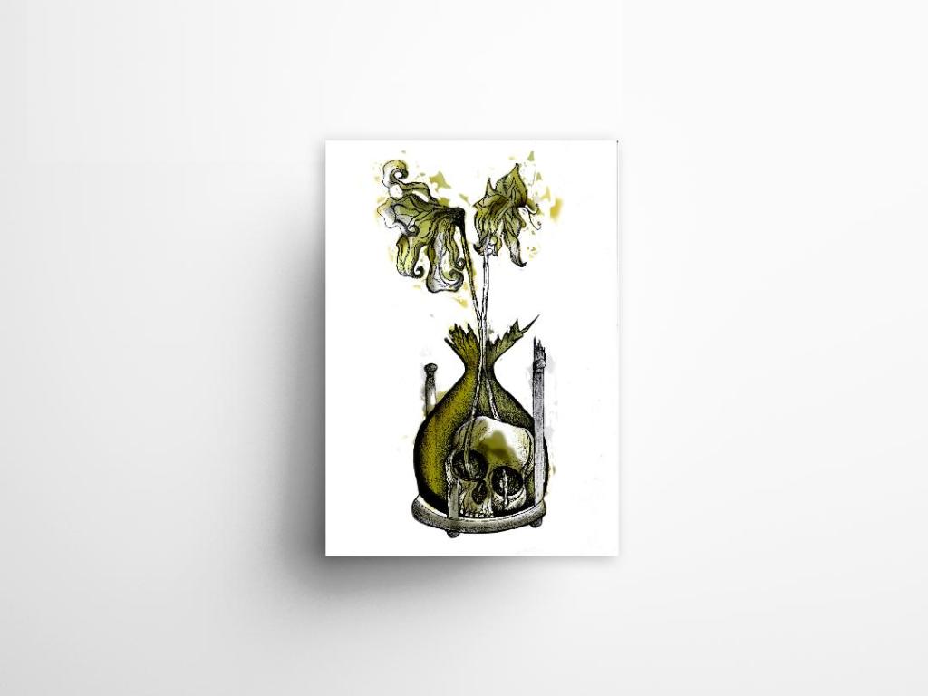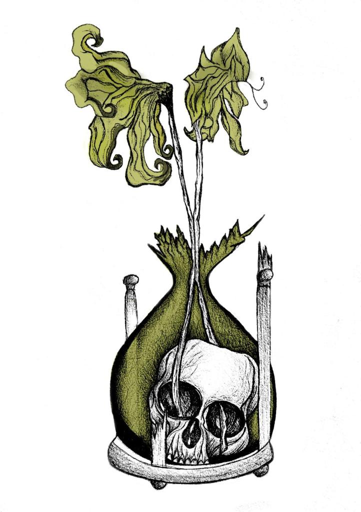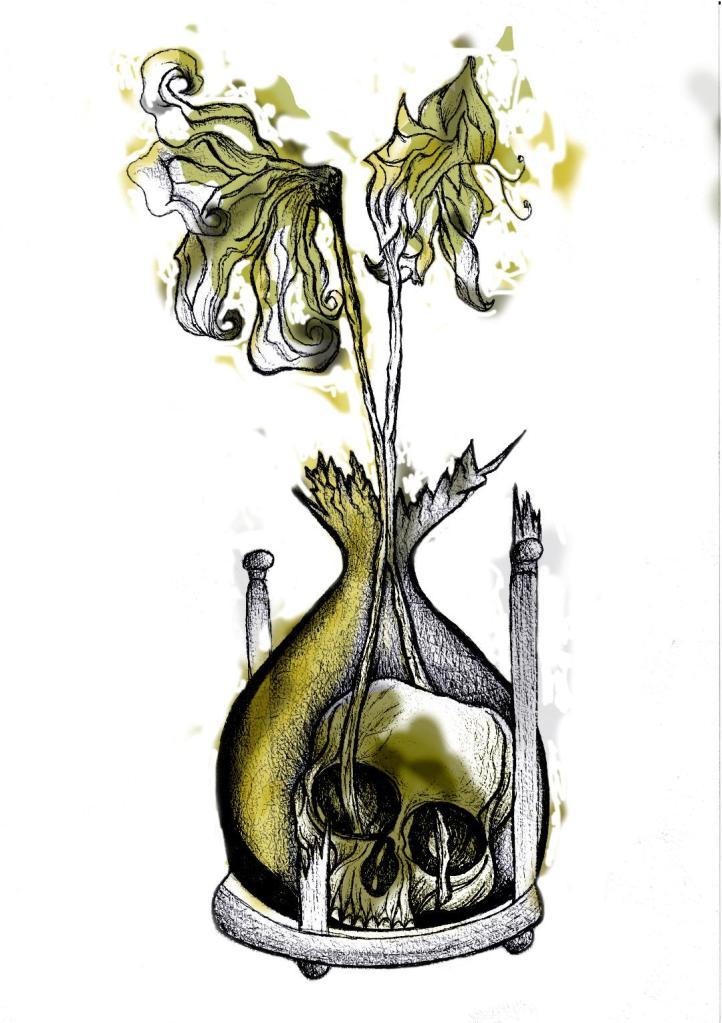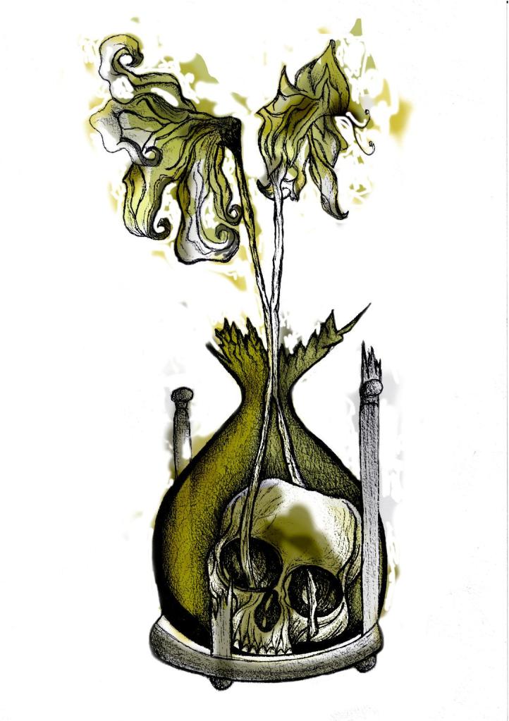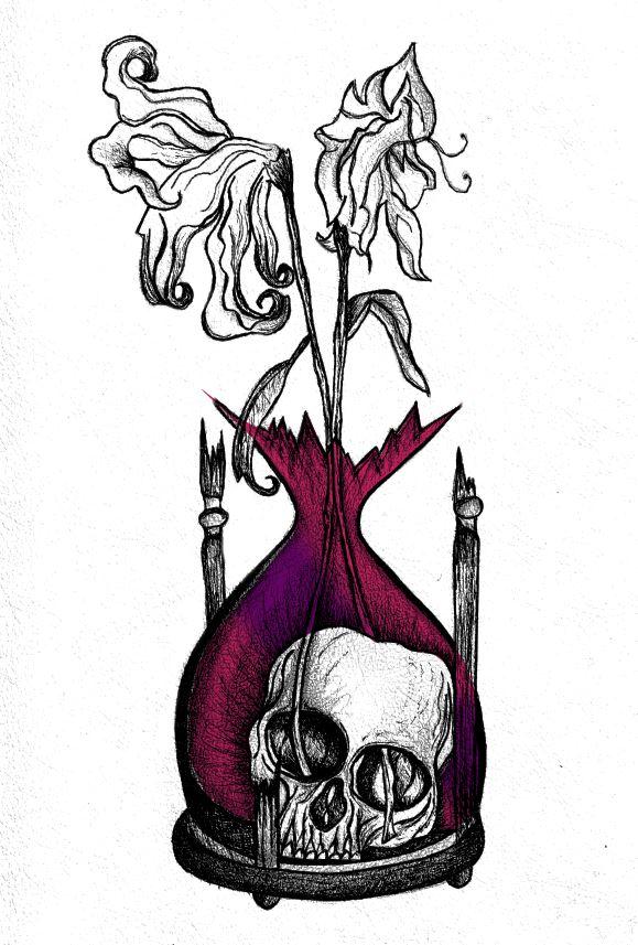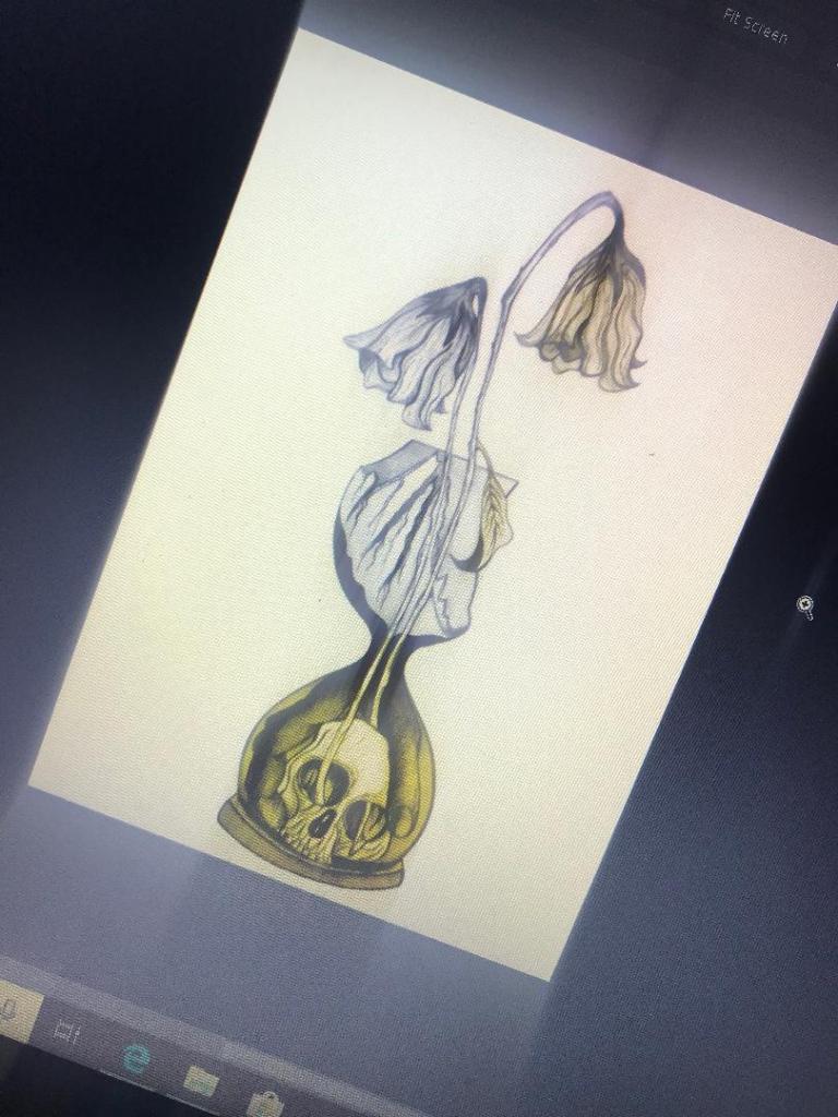 I finished off my first design drawing of the skull inside the botanical bottle and the 2 white dead flowers out of the top.