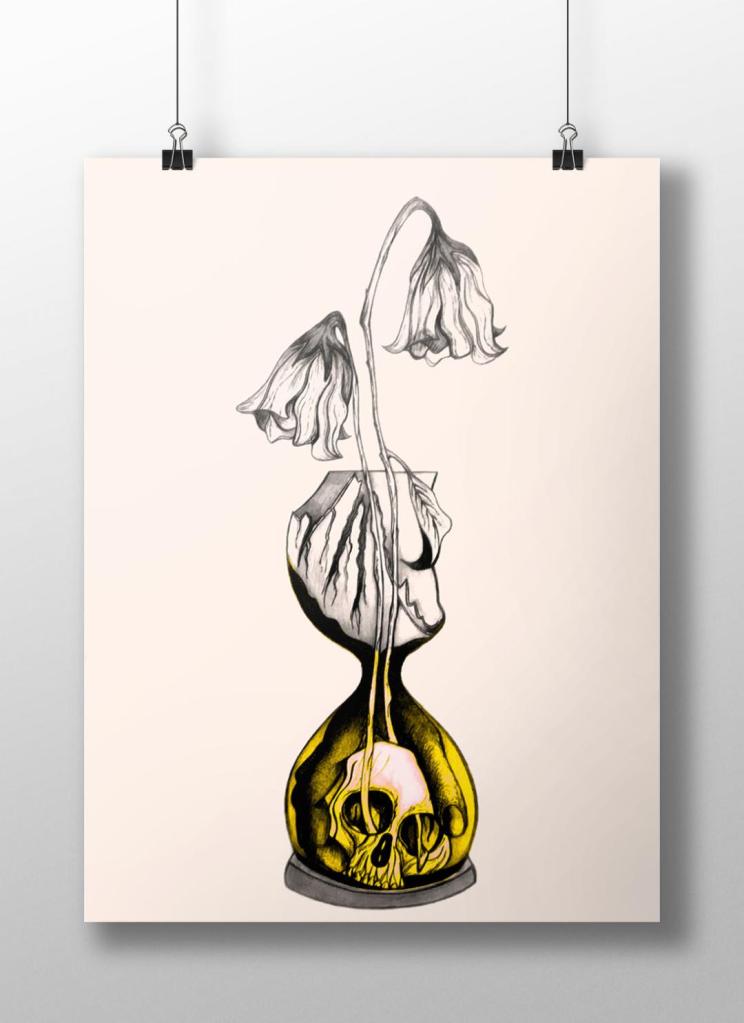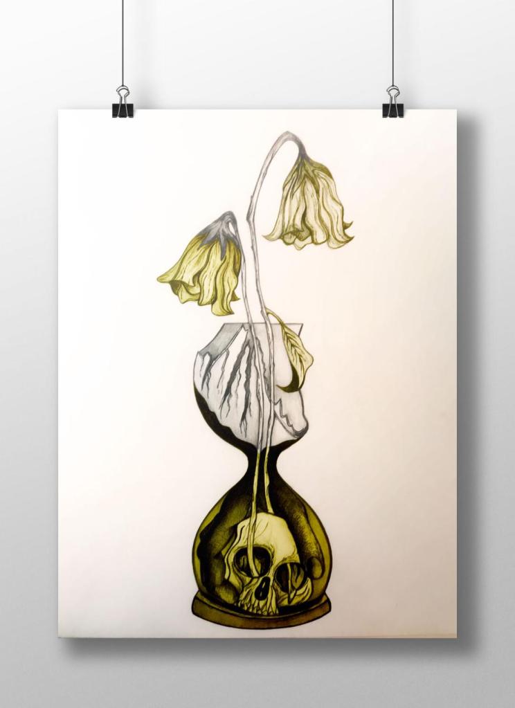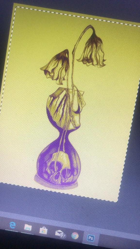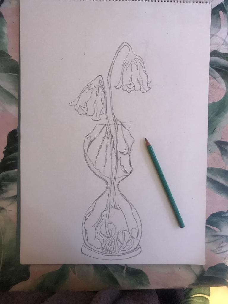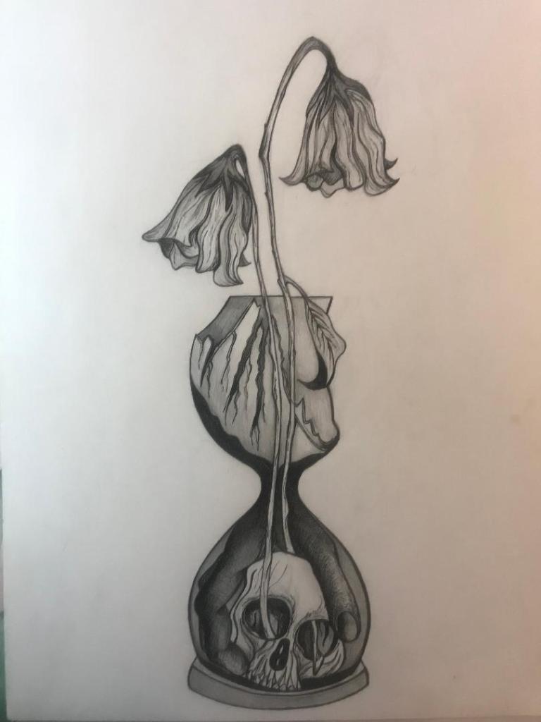 Sat on my break at work and I was asked how my uni work is going, I reached for my phone and passed it around the table to show what I have been working on… The feedback was good! – everyone thought my drawing was good!… however, there was some slight confusion as to whether the flowers were coming out of an hourglass timer (sand timer) or a regular broken vase… Having another look after a few days apart from it I could see where this could be confused. Although I was pleased with my drawing I felt like it was still missing elements.. I decided to redraw it… AGAIN! but this time make sure it is obvious that the flowers are coming out of a sand timer and not a “vase”!