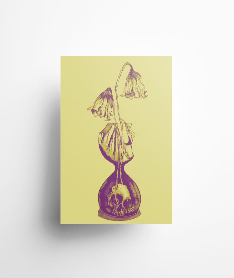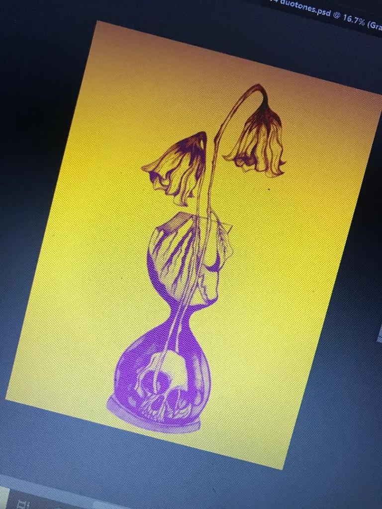 With the first version I adjusted the colours, brightness, vibrancy and saturation etc and then decided to use the pen tool to select certain areas to add colour. I like how it looks as a black and white ink drawing so I decided to only add colour to a few selected areas such as the flowers and the inside of the sand timer. The hand forms as part of the sand so I needed to keep this dark!