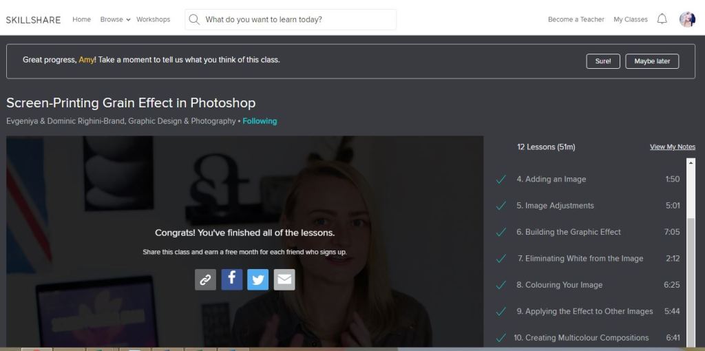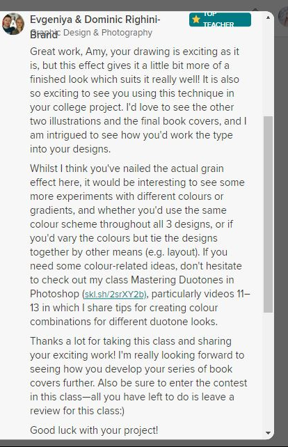 After I had finished the tutorial I also uploaded the finished piece to the Skillshare page for others to see (which is unknown for me!!- stepping out my comfort zone!) Here is the link below to what the tutor had to say to my piece!