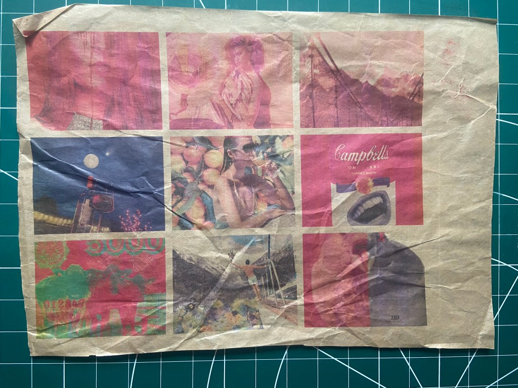 Although it is difficult to show on camera, the shiny, banana paper bag that you put your bananas in to weight them at the supermarket printed out quite nice and glossy! This is very similar to the tracing paper in that you are getting a very sensory experience as well as a visual one. I imagine it is also sustainable for the environment! The images are not as glossy as they appear on the tracing paper though.