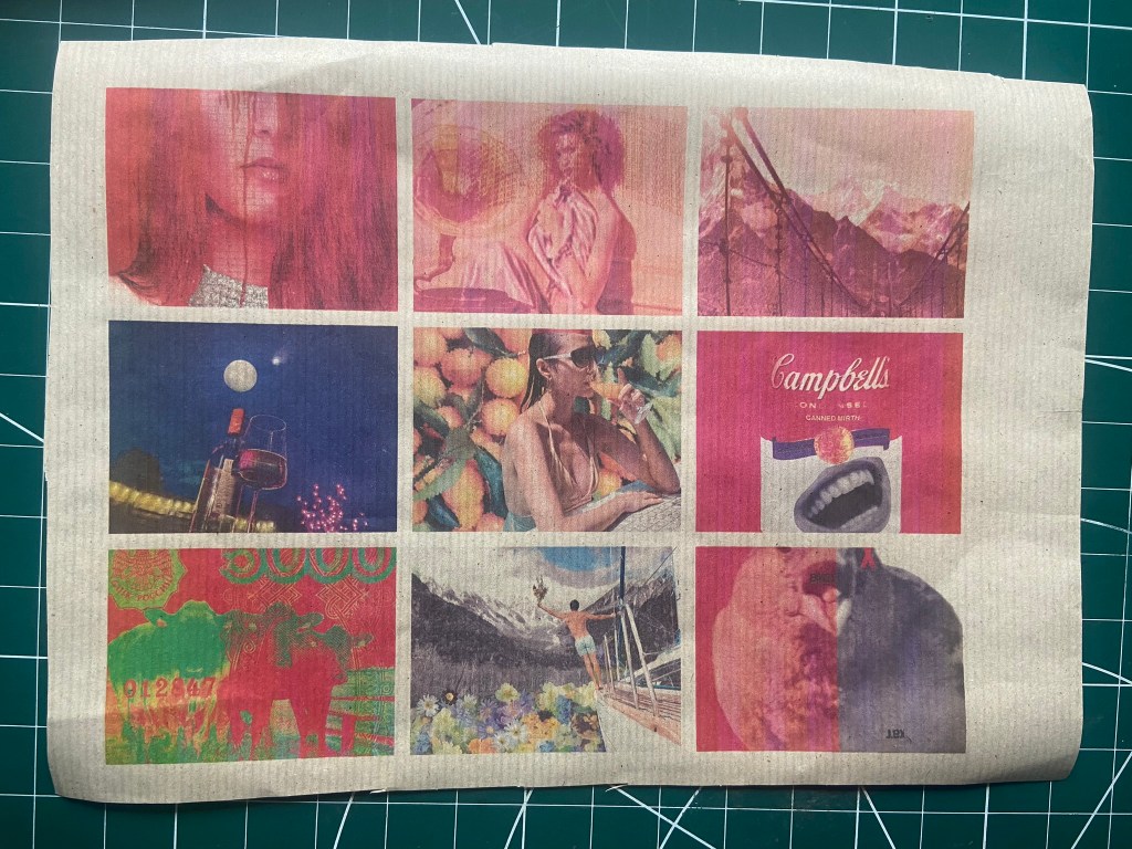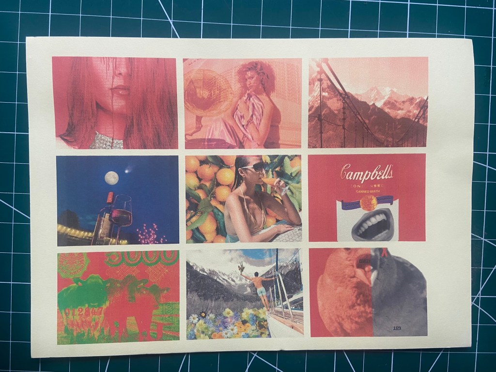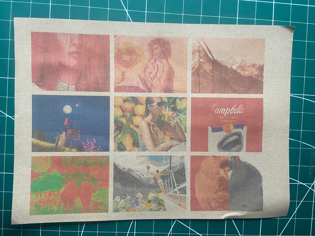 For this exercise I thought that it would just be easier to use the images I used for Tango with Cows, they are all the same size as well which made it easier. I wasn’t worried about the order of them now though. The home inkjet printer I have lets you print so many images to a page and because I am stuck at home poorly at the moment with no access to any other printer and my inks are low, I decided to be resourceful and print 9 to a page.