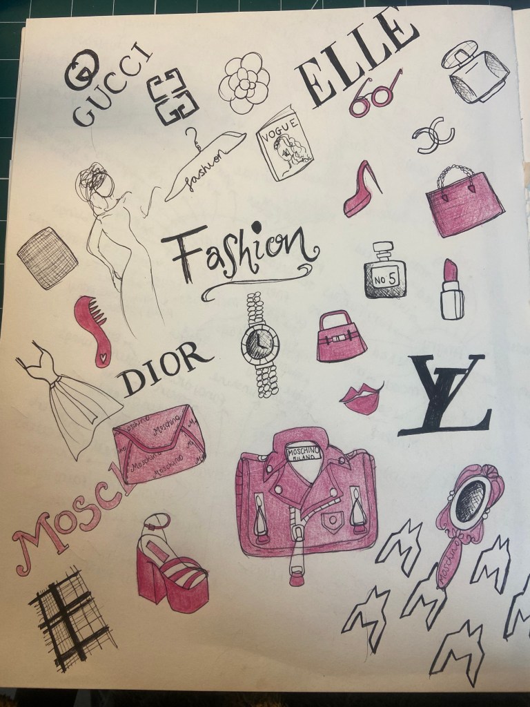 The word I chose for this brief is Fashion- I am interested in Fashion and also Fashion Illustration so it made perfect sense to choose this word. I did struggle with drawing images for it though. I don’t struggle with doodling and sketching ideas for design briefs of things that do not already exist but when it comes to drawing things that exist from memory I don’t find it much fun.. For example if the brief was to sketch new ideas for a new handbag I could draw 100s of different versions of new designs I have created! When it comes to drawing things that already exist I don’t find it as much fun.