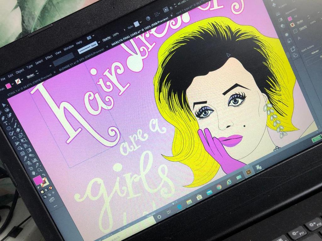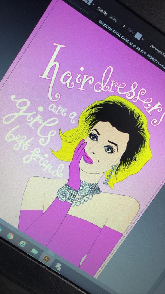 I then changed the colours of the text to match the cards and changed the stroke of the lettering and copied it over to the card documents to place behind the “blonde icons” (Marilyn, Debbie Harry and Christina Aguilera). I then cropped out any words that I did not need or that were out of the print border.