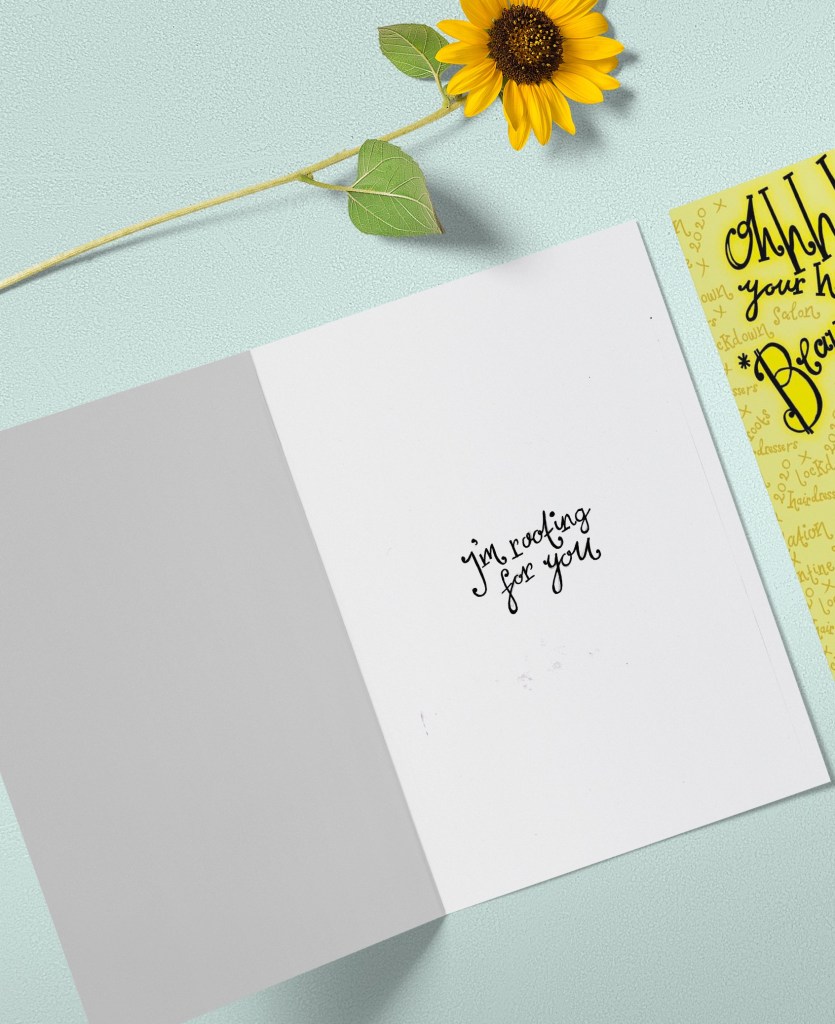 The next stage was to write the inside messages of the cards. I was unsure as to whether I wanted to use the same style of hand lettering that I had used on the front of all my designs or whether I wanted to use a more simplistic approach. Most greetings cards that are on the market use simple sans-serif fonts to feature inside the cards. I tried this out for mine using Helvetica. I also toyed with different messages for each of the cards; “Atomic (blonde)” for inside Blondies, “Don’t look at me” for Christina (the starting famous lyrics to Beautiful) and finally “I’m rooting for you” was the message I originally thought of with Marilyn’s.